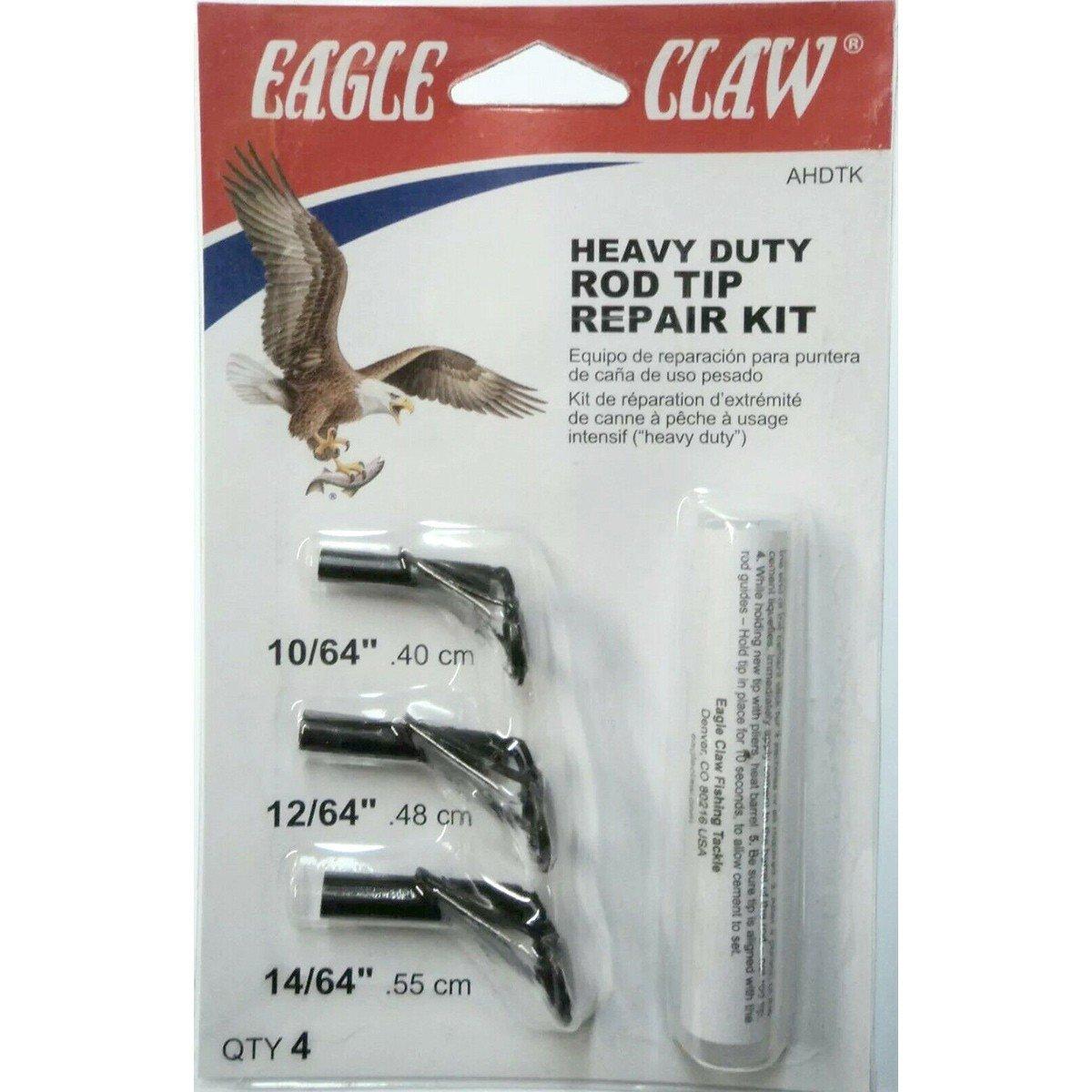Accidents happen. Fix up that broken tip with the Eagle Claw Heavy Duty Rod Tip repair kit. Includes three heavy duty tips in different sizes plus rod cement to keep the repairs in place.