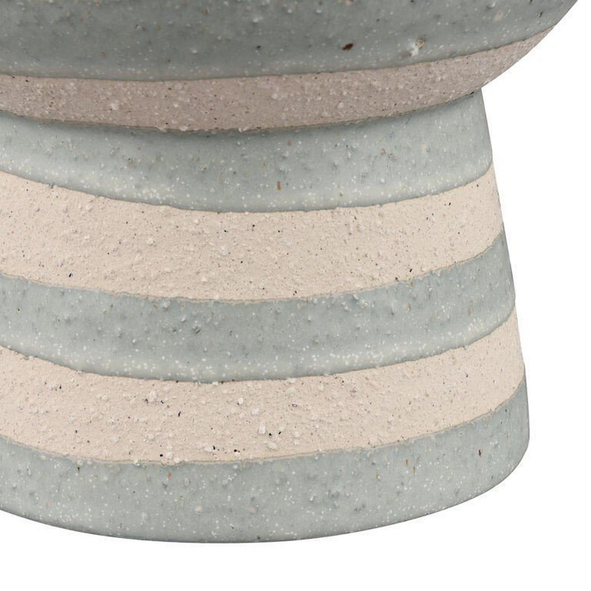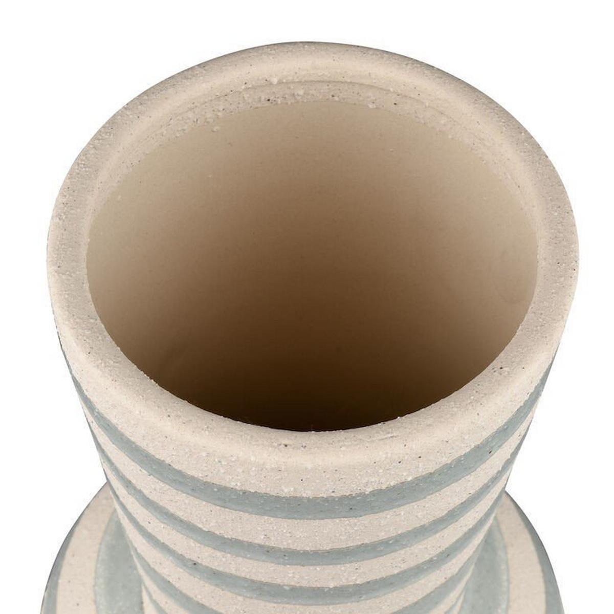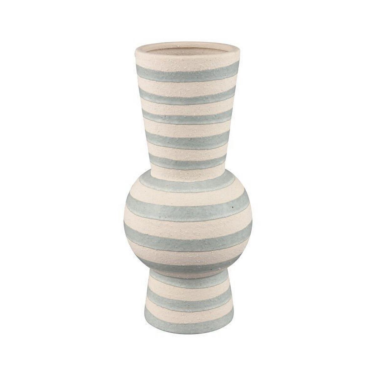 The Lena Vase is a tall decorative vase with a rounded center and a fluted neck. The earthenware vessel is painted with a charming striped pattern, adding to its playful look.