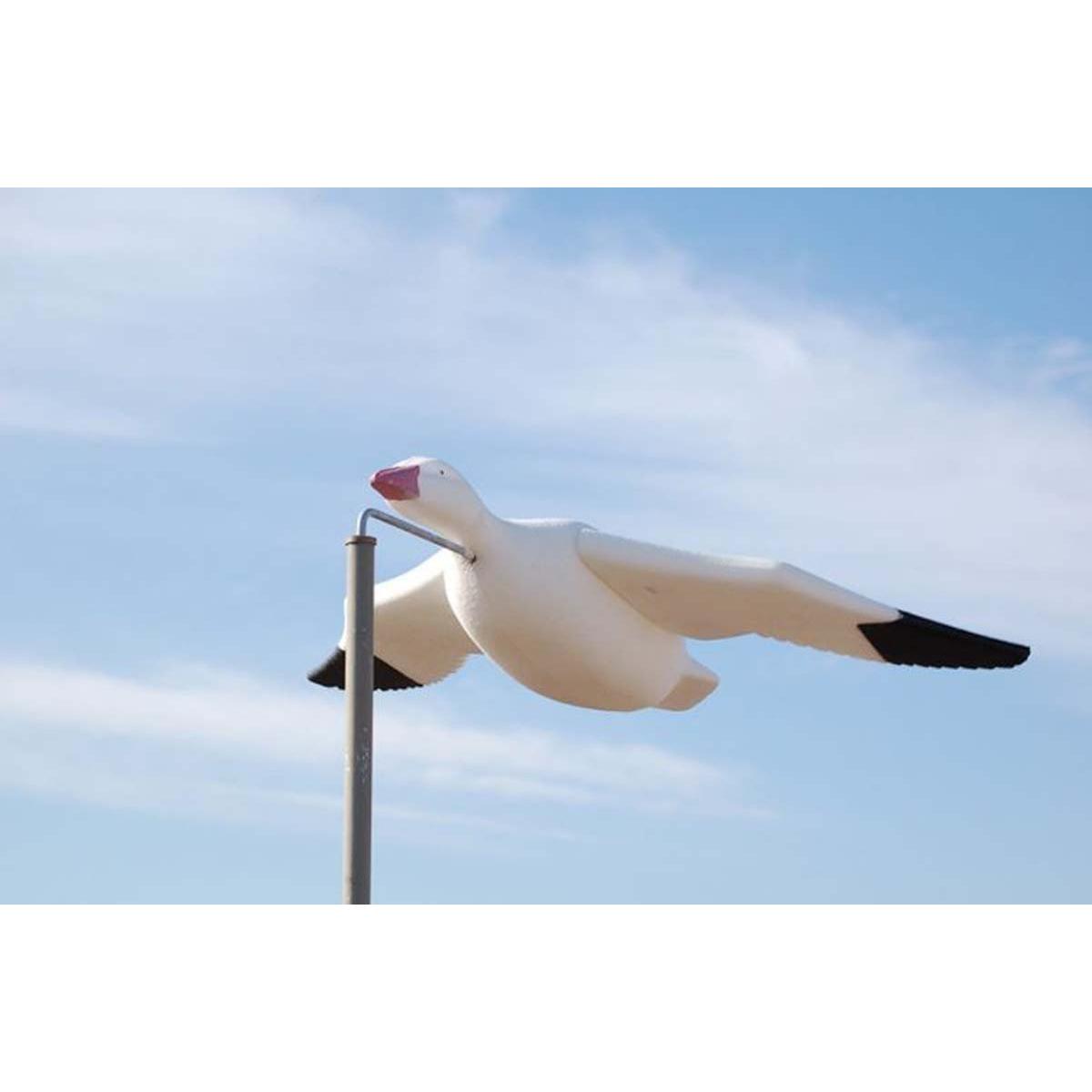 These fully painted Snow Goose Feather Flyers are highly effective wind activated decoys that will not shine. They are excellent Snow goose decoys... and well worth the money. These are the latest version with the curved wing tips. This new design moves better than ever. Feather Flyer Decoys move in the wind and duplicate the whiffling movement of birds coming into land.