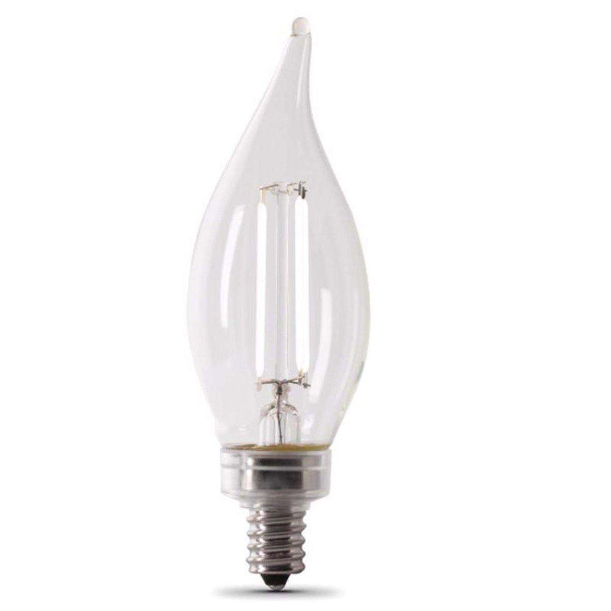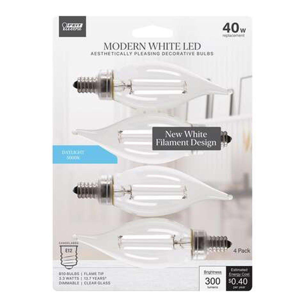 Upgrade your lighting to Feit Electric's elegant Exposed White Filament LED Light Bulbs for a fresh take on decorative bulbs. These first-of-their-kind white filament bulbs take a traditional flame tip bulb with exposed filament encased in clear glass and add lower-profile white filaments. Unlike yellow filaments, these blend into your current decor, for a timeless look that complements any room. They give off a 5000K Daylight White glow ideal for craft rooms, bathrooms, kitchens, laundry rooms, utility rooms, and anywhere you desire invigorating light. Their bluish-white light is perfect for reading, working on intricate projects, and seeing fine details. These dimmable bulbs fit in any E12 Candelabra base such as chandeliers, wall sconces, pendant lights, and more. With a 90+ CRI, these bulbs make colors appear more vivid and true-to-life. The BPCFC40950CAWFIL/4 emits 300 lumens while only using 3.3 watts of electricity, up to 91.8% less energy than equivalent 40-watt incandescent bulbs. Get up to 15,000 hours/13.7 years of use (based on 3 hours per day use) with an estimated annual energy cost of only $0.40. Create a stylish feel that instantly enhances any home or commercial space.