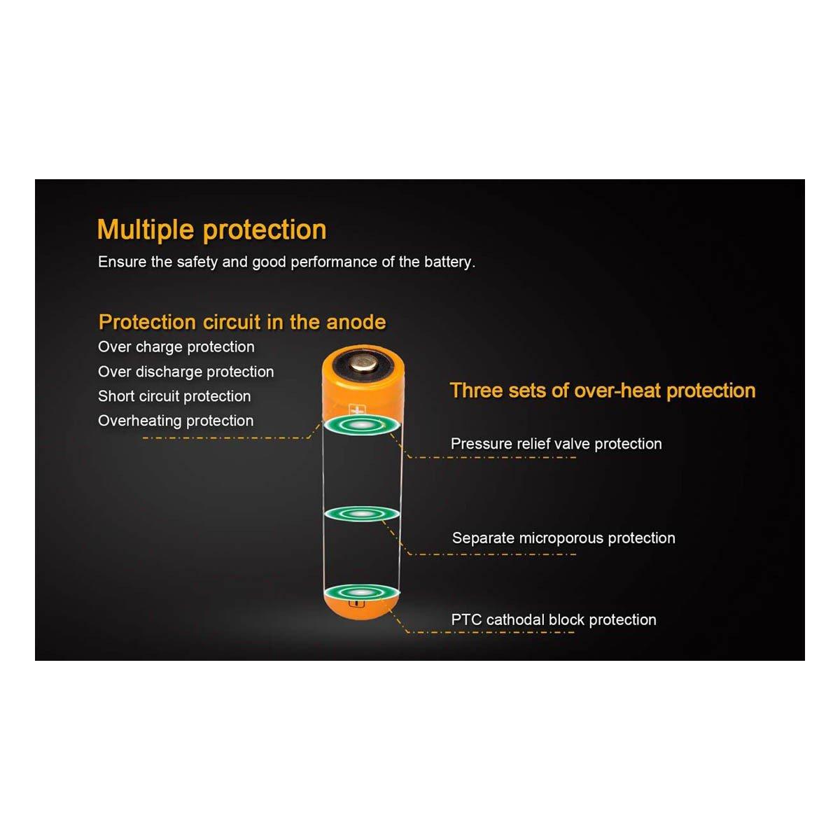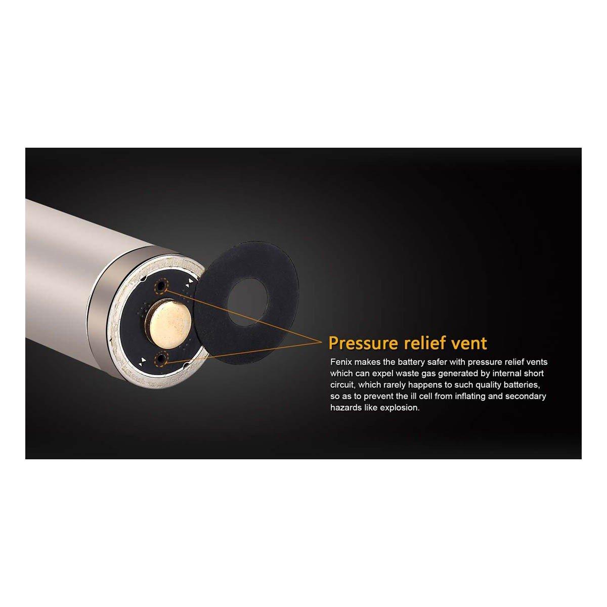 In addition, Fenix batteries are built with safety in mind. There are built in features to prevent short circuits, design multiple layers of protection and the new button-top design. The high capacity 18650 Li-ion rechargeable batteries each provide protection circuits in the anode to help prevent short circuits, over charge/discharge and over heating. Each battery also includes pressure relief vents which expel waste gas in the rare case of an internal short circuit preventing an explosion.
