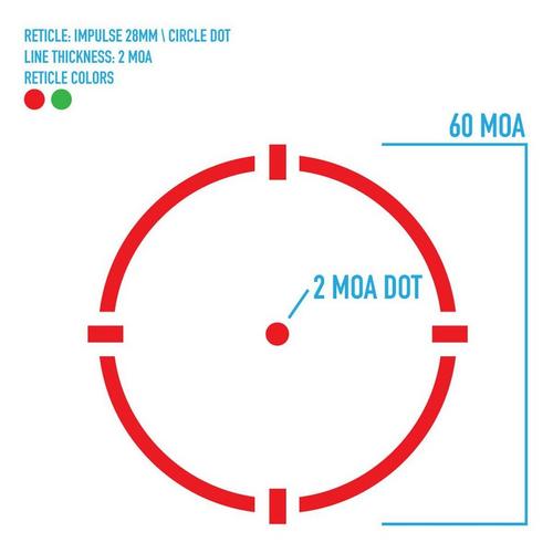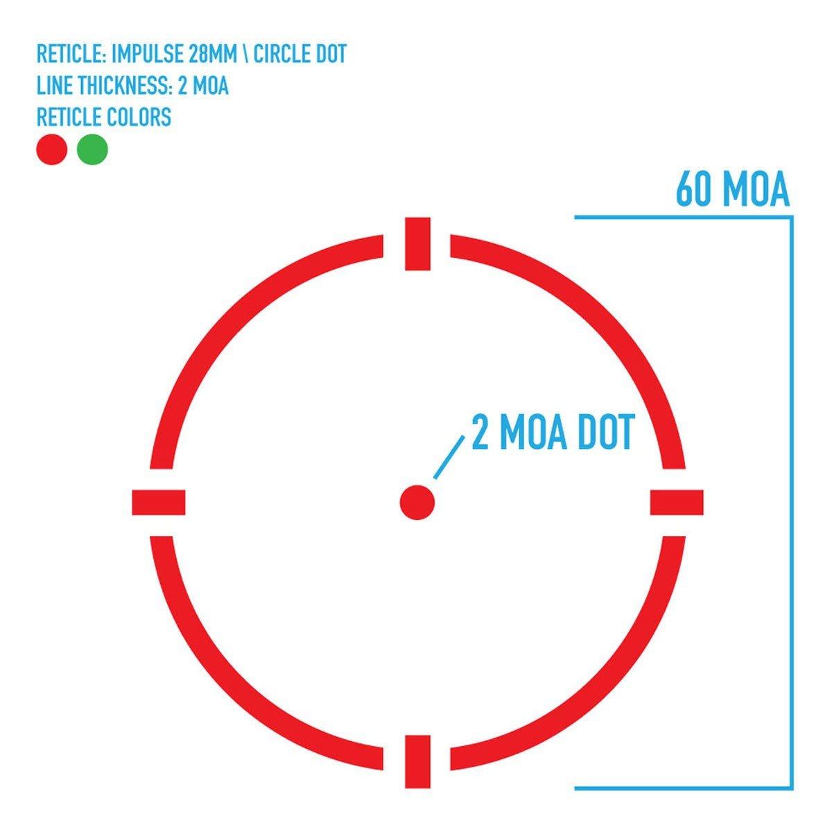 With an integrated red laser for lightning fast target acquisition, the Firefield Impulse 1x28 Dot Sight with Red Laser brings Victory to your close-quarters pursuits. Ideal for target shooting and hunting on rifles and shotguns, this compact parallax corrected sight features a cantilever mount design, allowing it to be forward mounted for use with a magnifier. Thanks to a strong aluminum construction, the Texas designed Impulse handles up to .50 caliber recoil and is shockproof, fog proof and IPX5 weatherproof. One AAA battery powers the sight and laser, achieving 14.2 hours of continuous use with both the laser and reticle turned on. Hand adjustable windage and elevation along with a light weight of just 10.9 oz. add to Impulse’s user-friendly design. Included with the Impulse are lens caps and battery.