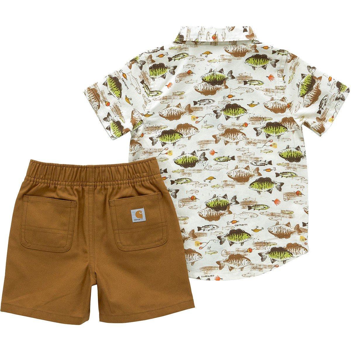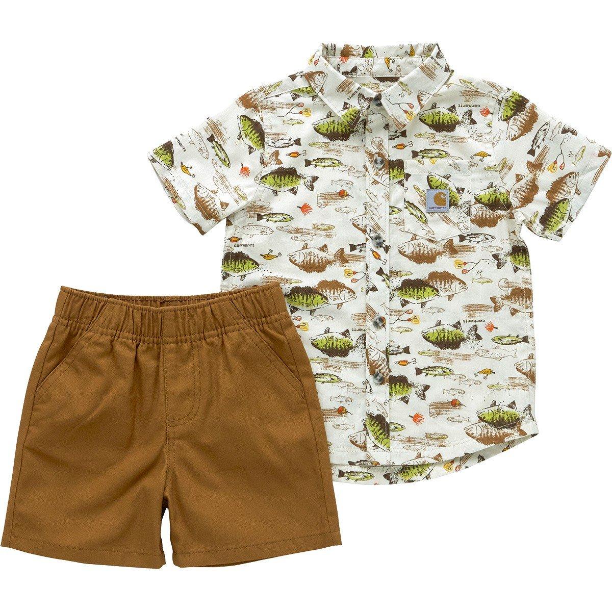 {"reviews":[],"offset":0,"limit":10,"total":0}"Full Description:\nHe might be too little for the job site, but your toddler is never too young to look the part. This little boys' Carhartt set includes a cotton tee and a pair of striped twill shortalls. The tee has a tagless label to reduce that scratchy feeling, and the shortalls adjust with straps.\n\n"
