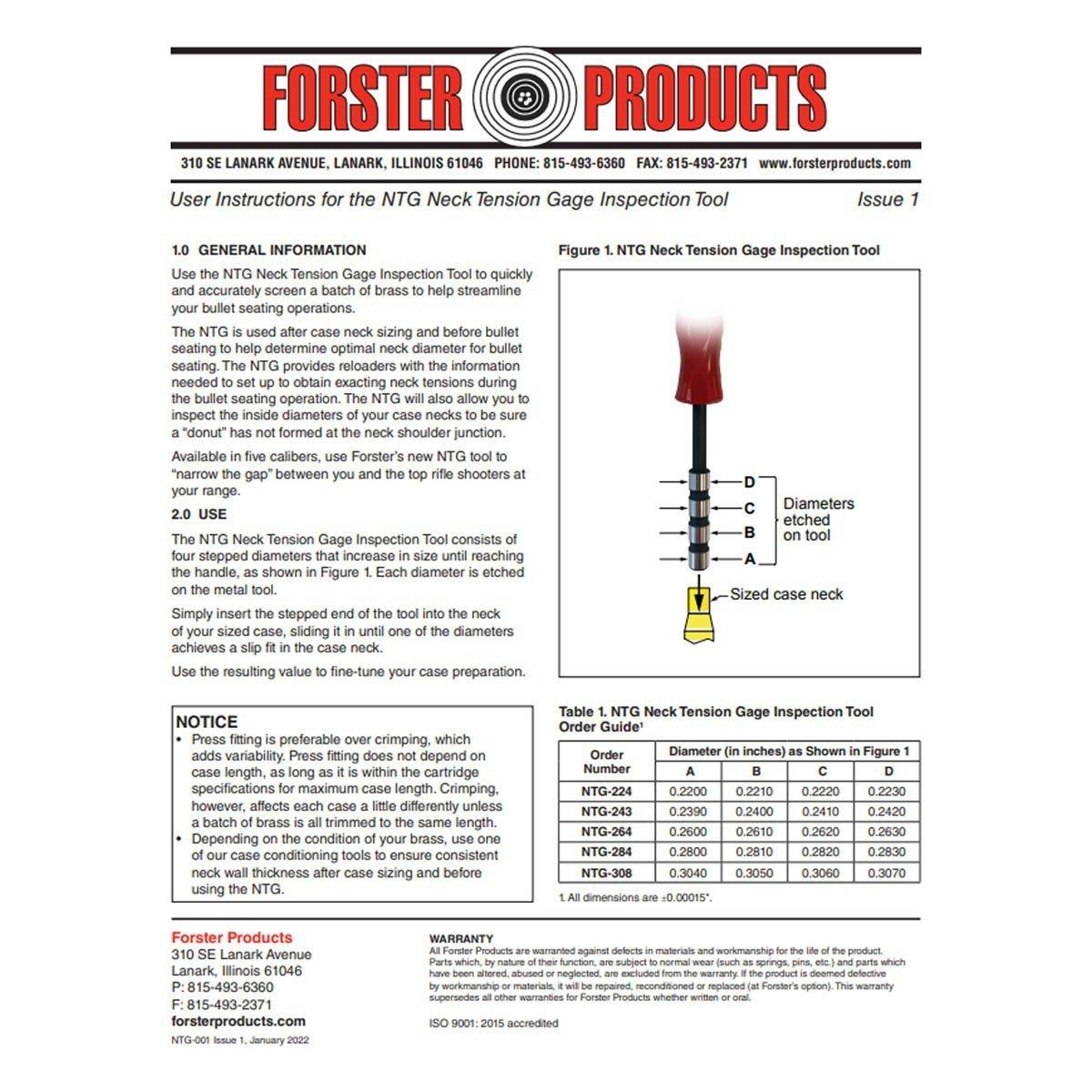 Use the Neck Tension Gage (NTG) as an inspection tool to quickly and accurately screen/sort a batch of brass before your bullet seating operation. The NTG provides reloaders with the information needed to create exacting neck tensions during the bullet seating operation. Use after case neck sizing and before bullet seating to help determine optimal inside neck diameter for consistent release of a bullet from your reloaded rounds. Allows for inspection of the inside diameters of case necks to be sure a “donut” has not formed at the neck-shoulder junction.