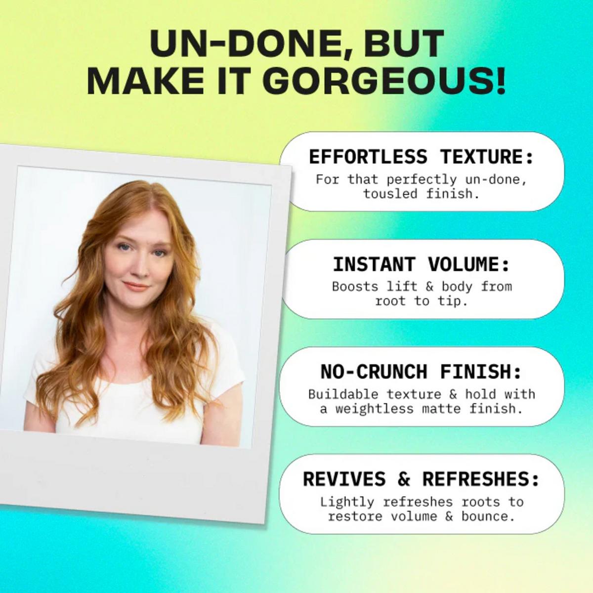 Undone but make it gorgeous! Tossed Up Dry Texture Spray is your shortcut to sultry tousled texture, major volume, and flexible, crunch-free hold. This dry finishing spray adds buildable body and oomph for that effortlessly undone, perfectly imperfect look — no bedhead required. It combines the hold of a light hairspray with the volume-boosting power of a dry shampoo to deliver instant texture, lift, and light refreshment, all with a weightless matte finish. Spray, tousle, go — because your hair deserves main character energy every day.
