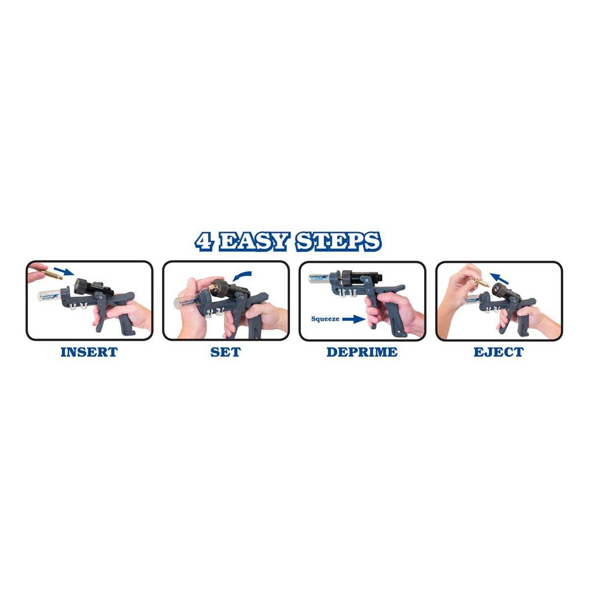The Frankford Arsenal Hand Deprimer is made of robust die cast aluminum and features a Universal Collet System. In just 4 easy steps you can deprime your spent brass by hand. No need to set up your press and reset your dies to deprime a few cases. This system is fully contained. It even captures the spent primers in a collection tube so you can dump them later. The Universal Collet System can handle brass from .20 cal all the way up to .338 lapua. This deprimer can even deprime pistol brass. Military crimped primers are easily removed as well with the full length ergonomic grip. Deprimer ships with the standard .08" diameter decapping pin, which is replaceable.