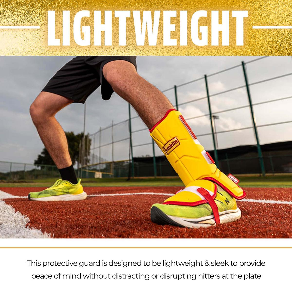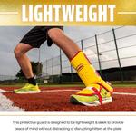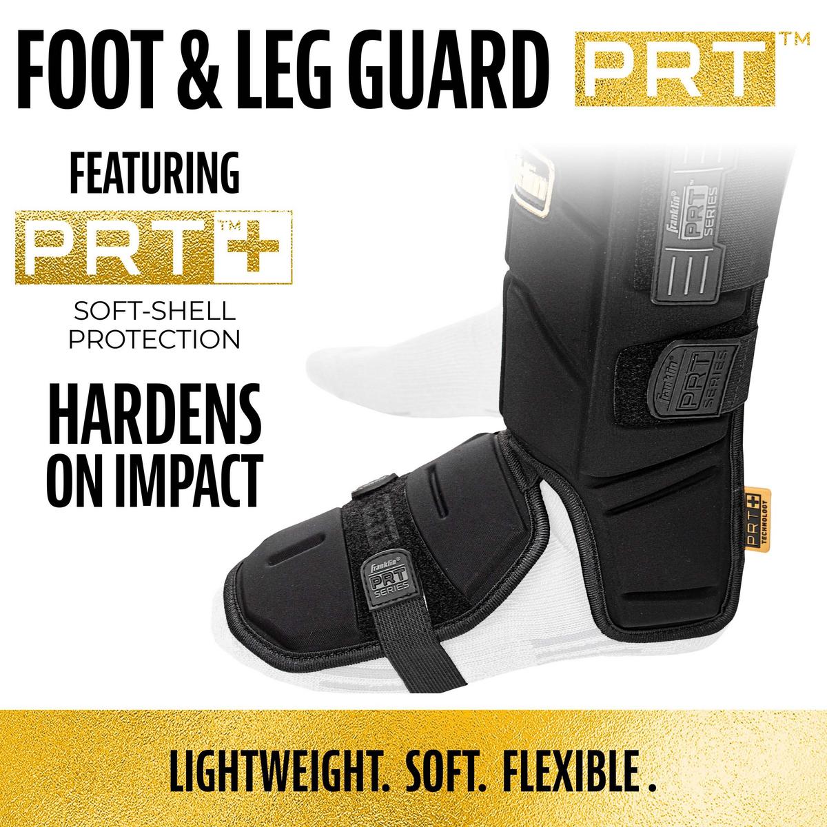 Protect yourself at the plate with Franklin Sports' PRT Adult Baseball + Softball Leg Guard! Give yourself confidence and peace of mind when you step into the batter's box with this protective leg and toe plate shield. With so many small and fragile bones in the leg and feet, hit-by pitches can be costly in terms of pain and injury. This shin, ankle and foot protective pad is designed to absorb the force of the impact to reduce the likelihood of injury. This adjustable baseball leg guard is easy to strap on and is designed to be sleek and comfortable so it won't impede your swing. The soft-shell protector hardens on impact to lessen the damage caused by the ball and gives players added confidence during their at-bat. The leg and toe plate protector also offers double the coverage of other leg guards on the market by extending down both sides of the ankle for additional protection. Designed to be sleek and lightweight, this leg guard is designed to fit comfortably for both right hand and left hand hitters. Plus, over time, the flexible interior shell will mold to the shape of your leg for a unique, comfortable fit. So step to the plate with ultimate confidence and protection for your next at bat and grab your Franklin Sports PRT Softball + Baseball Leg Guard today!