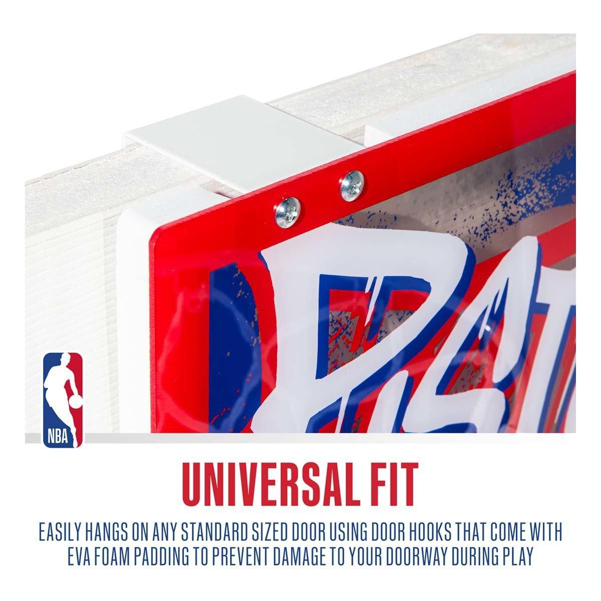 Bring all the fun of NBA basketball inside with Franklin Sports' NBA Kids Over the Door Basketball Hoop Sets! Designed with official NBA team logos and colors, these mini basketball hoop sets are the perfect way for young fans to play and feel like their favorite basketball stars. Each set comes with (1) NBA team over the door basketball hoop, (1) mini basketball, and (1) air pump included, so you have everything you need to play right out of the box. The kids mini hoop is super easy to assemble and is designed to fit on any sized door. Plus, the mini hoop hooks are constructed with a foam backing to prevent any damage to your doors during game play. Made with shatterproof backboards and a 9.5" inch spring-loaded steel rim, these indoor mini hoops are designed for premium, durable performance. These hoops are 3 pointer and slam dunk approved, so kids can practice all their favorite basketball skills. So if you're looking for the perfect gift for the young basketball fan in your life, look no further and grab your Franklin Sports NBA Kids Over the Door Basketball Hoop Set today!