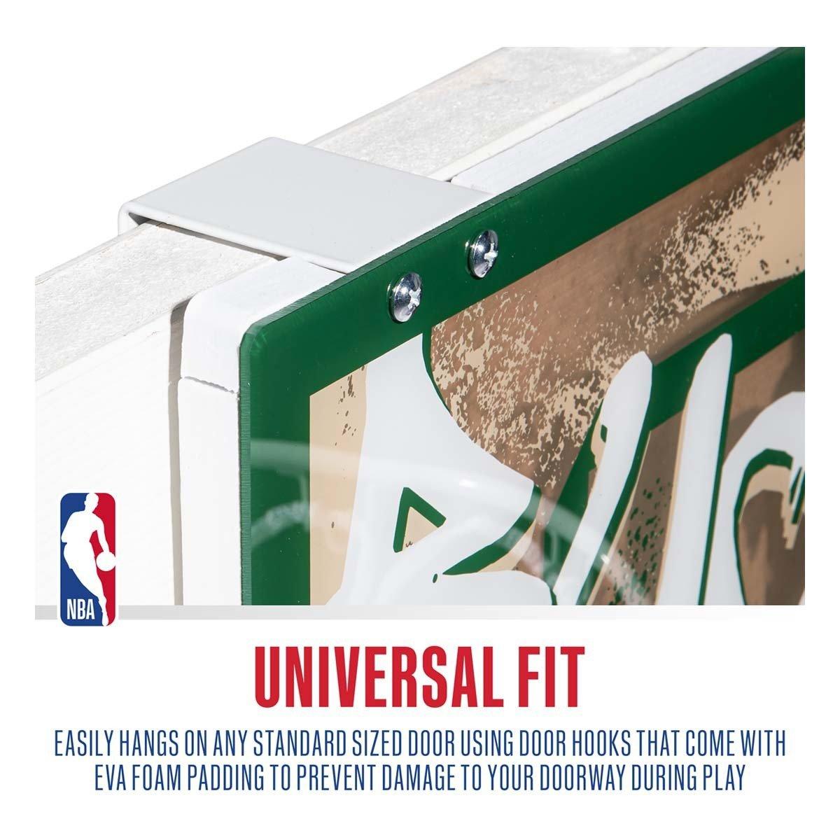 Bring all the fun of NBA basketball inside with Franklin Sports' NBA Kids Over the Door Basketball Hoop Sets! Designed with official NBA team logos and colors, Over the Door basketball hoop sets are the perfect way for young fans to play and feel like their favorite basketball stars. Each set comes with (1) NBA team over the door basketball hoop, (1) mini basketball, and (1) air pump included, so you have everything you need to play right out of the box. The hoop is super easy to assemble and is designed to fit on any sized door. Plus, the hoop hooks are constructed with a foam backing to prevent any damage to your doors during game play. Made with shatterproof backboards and a 9.5" inch spring-loaded steel rim, these indoor Over the Door hoops are designed for premium, durable performance. These hoops are 3 pointer and slam dunk approved, so kids can practice all their favorite basketball skills. So if you're looking for the perfect gift for the young basketball fan in your life, look no further and grab your Franklin Sports NBA Kids Over the Door Basketball Hoop Set today!
