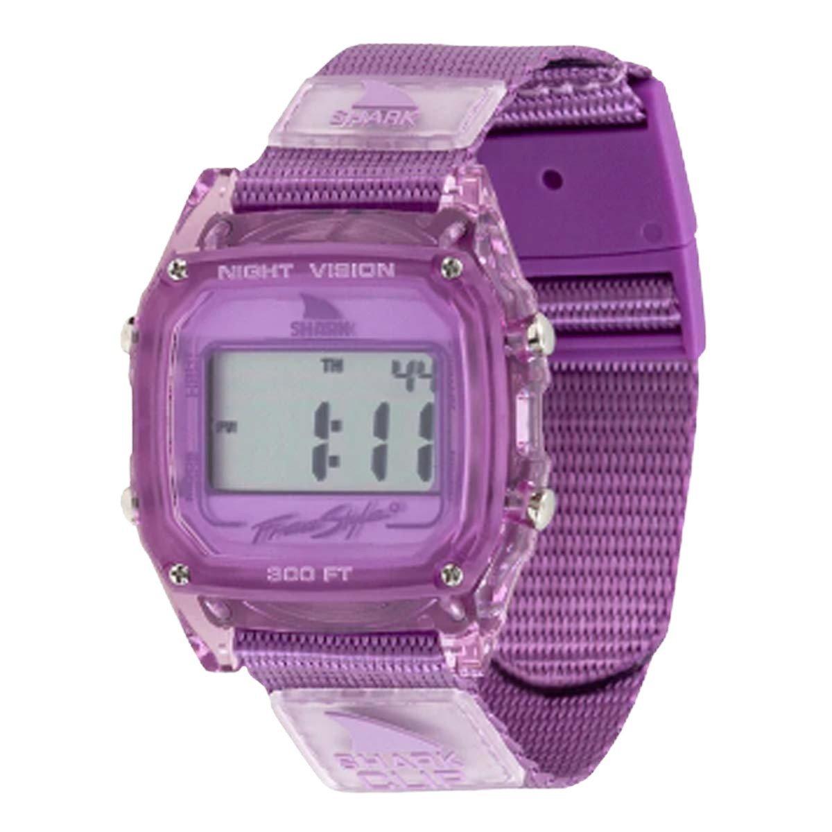 Elevate your summer style with the Plum Shark Clip Watch from Freestyle's Jelly Bean Collection! Featuring a transparent purple case and a deep Plum-colored Shark Clip strap adorned with our new signature see-through patches, this watch is a statement piece for your adventurous lifestyle. Whether you're diving into water sports or lounging by the pool, its water resistance up to 100m ensures durability and reliability. Stay punctual with digital timekeeping, dates, and countdowns, and enjoy the convenience of essential features like stopwatch, timer, and alarm. Perfect for collectors and watch enthusiasts alike, the Plum Shark Clip Watch promises to amplify your summer vibes with its vibrant design.