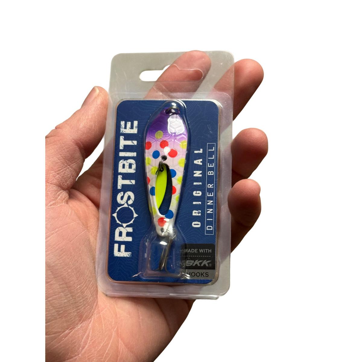 The Dinner Bell is a catch-all spoon! The noise and commotion caused by the inner blade offers a truly unique action with lifelike appeal. This is a fantastic jigging (or casting or trolling) lure for targeting Walleye, Panfish, Trout, Bass, Pike, and many more. Featuring premium black nickel components, including the sharpest, strongest treble hooks available and a low profile cross-lock snip snap. Sold as 1 per pack. *All images shown feature the 3/8 spoon for representational purpose.