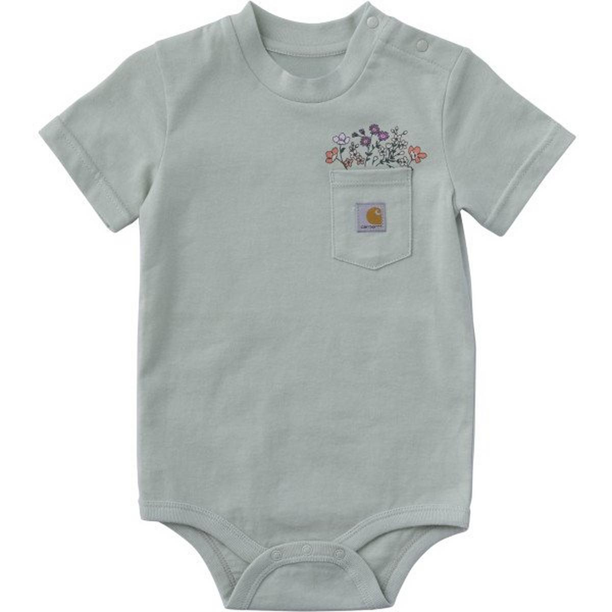 {"reviews":[],"offset":0,"limit":10,"total":0}"Full Description:\nPocket full of posies. This bodysuit is every bit as durable as grown-up Carhartt tees, but a floral graphic by the chest pocket adds a playful touch. It's made from soft cotton fabric, with snaps at the shoulder and crotch for easy outfit changes.\n\nFeatures:\n\u003cul>\n\u003cli>Regular fit strikes a comfortable balance between loose and snug\u003c/li>\n\u003cli>Midweight, 5.3-ounce, 100% cotton jersey\u003c/li>\n\u003cli>Rib-knit crewneck with shoulder snap placket for easy on and off\u003c/li>\n\u003cli>Crotch snaps for easy changing\u003c/li>\n\u003cli>Left chest pocket\u003c/li>\n\u003cli>Tagless neck label for a smooth feel\u003c/li>\n\u003cli>Machine Washable\u003c/li>\n\u003c/ul>\n\n"