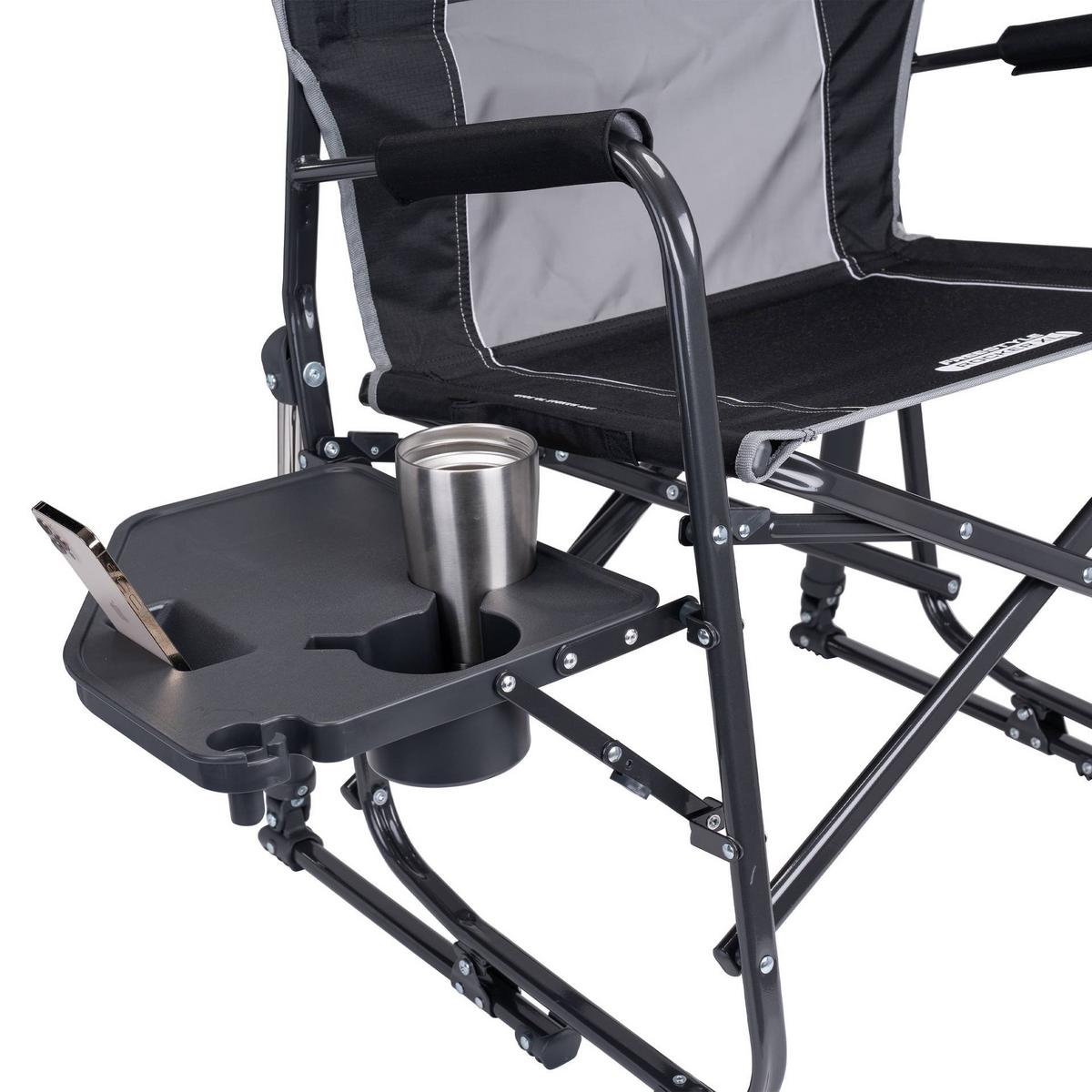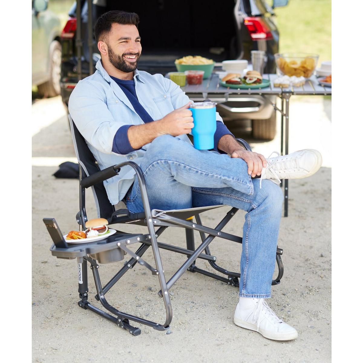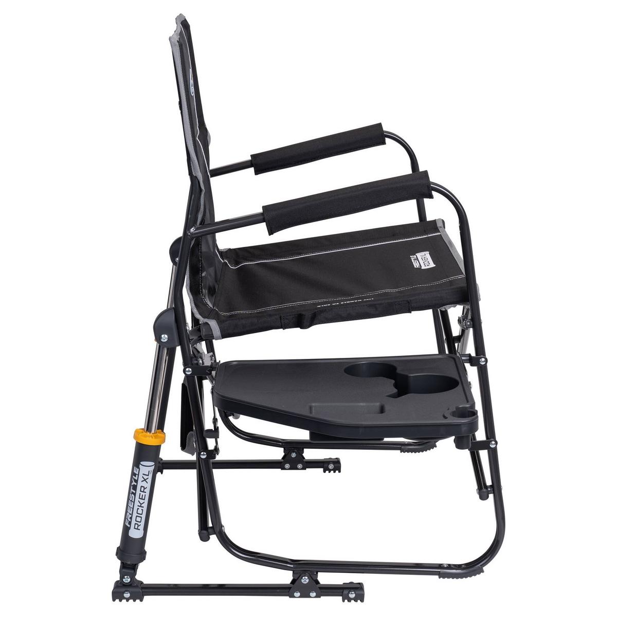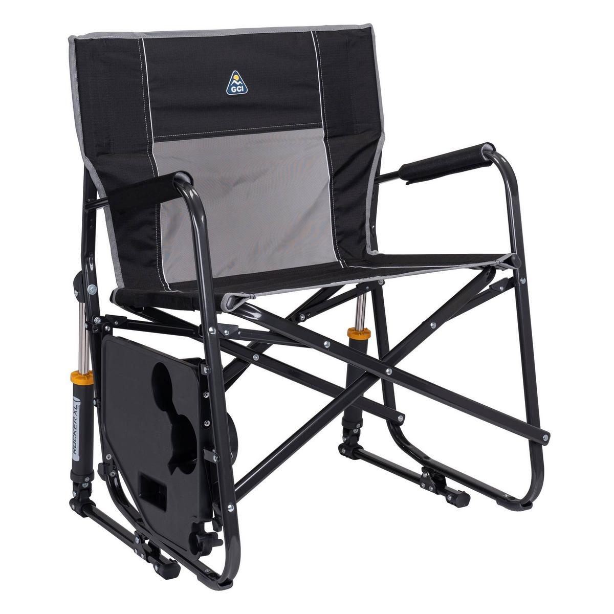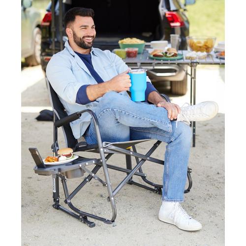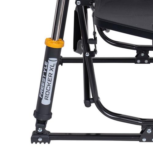 Extra room meets extra convenience in the GCI Outdoor Freestyle Rocker™ XL with Side Table. Featuring patented Spring-Action Rocking Technology™ for a smooth rocking motion, a wider seat with an increased weight capacity of 400 lbs., plus an integrated table, it’s the perfect combination of comfort, functionality and durability. The ergonomic design promotes a natural seated position, with padded armrests providing additional support when sitting down and standing up. A breathable mesh panel in the backrest enhances airflow to keep you cool and dry, while the foldable side table—with a built-in beverage holder, snack space, and a phone pocket—keeps essentials within reach. The durable, powder-coated steel frame features Eazy-Fold™ Technology for effortless setup and closure, along with a convenient carry handle for easy transport to all your outdoor activities.