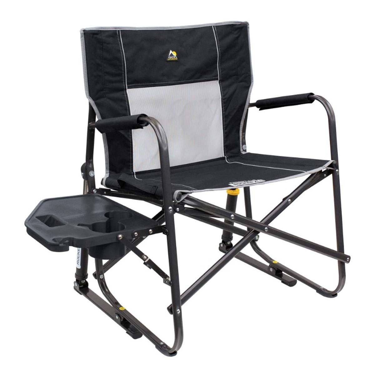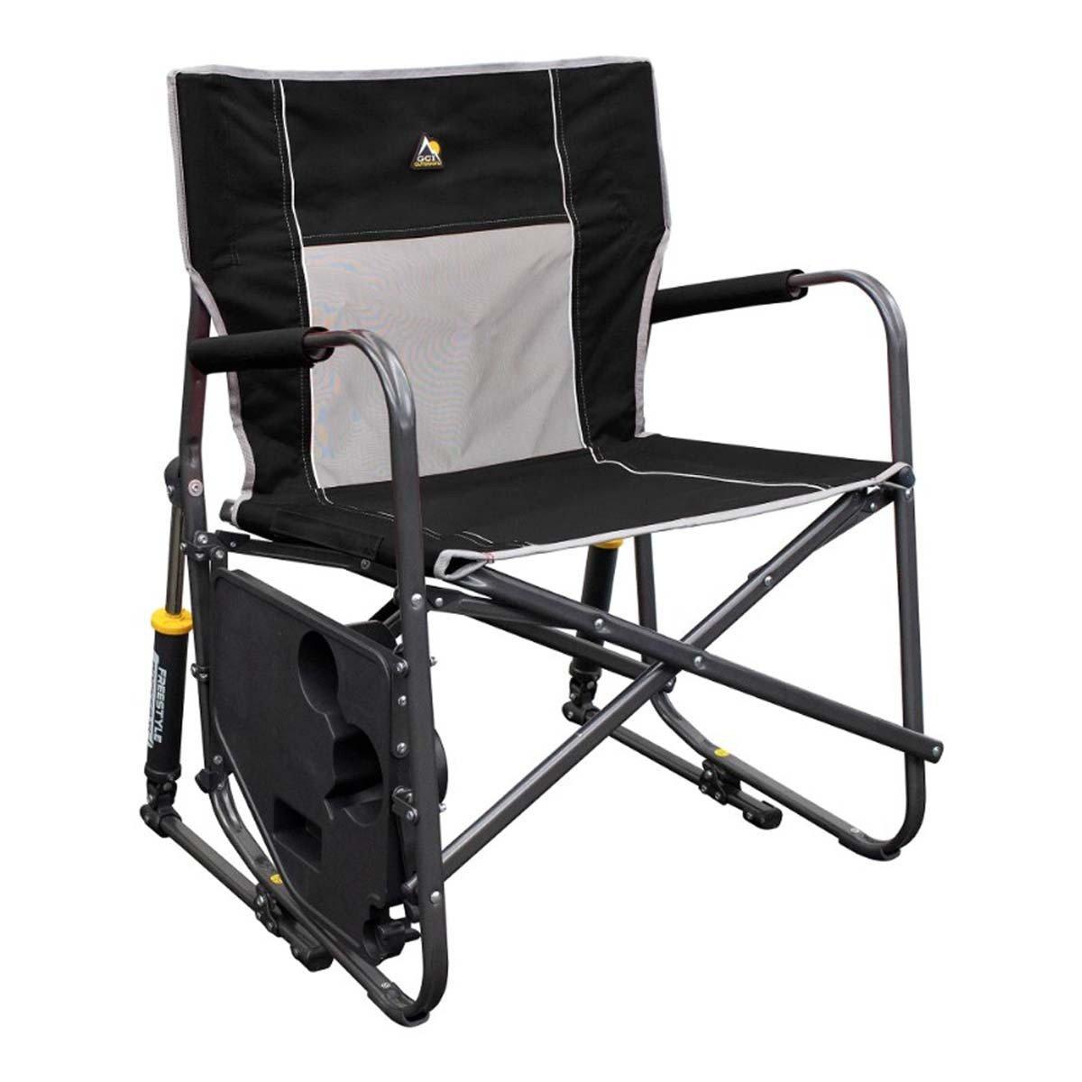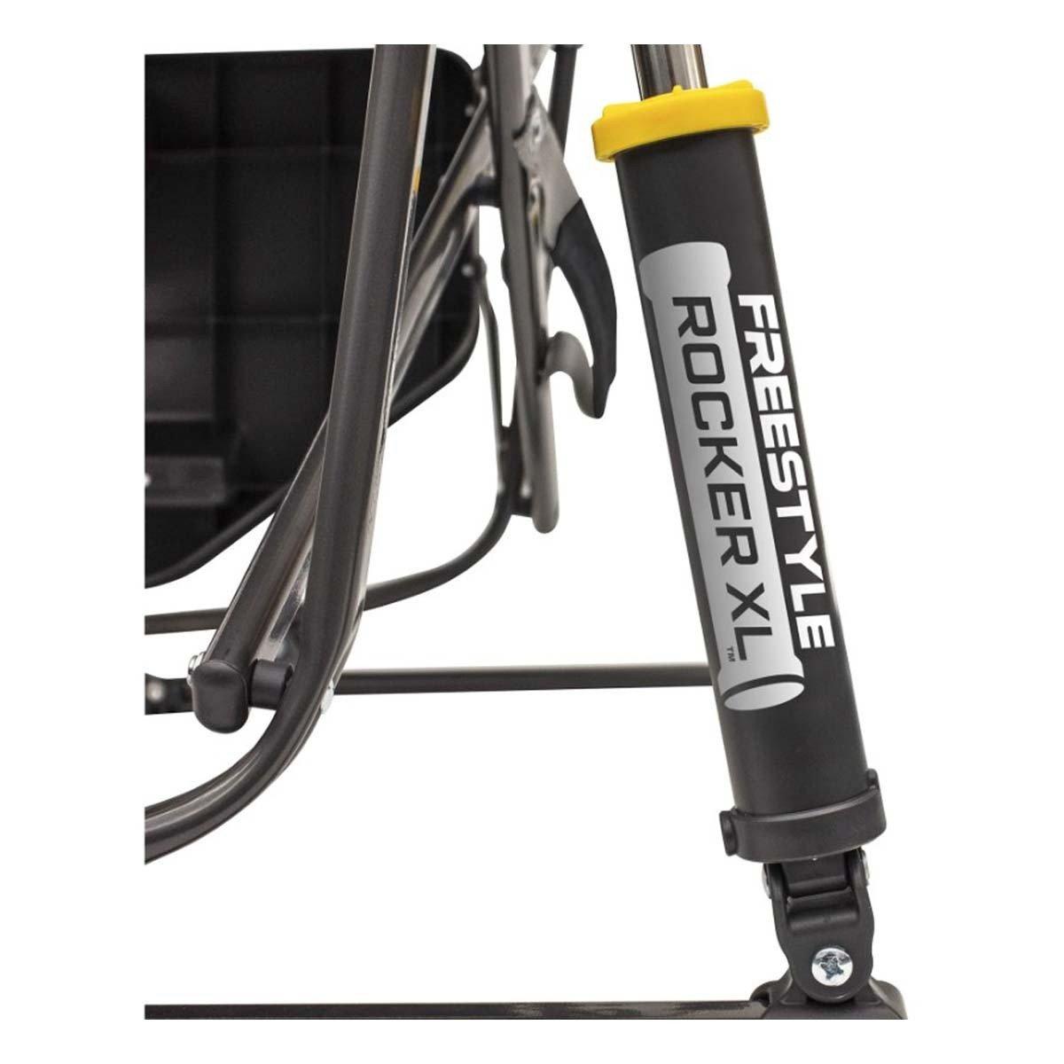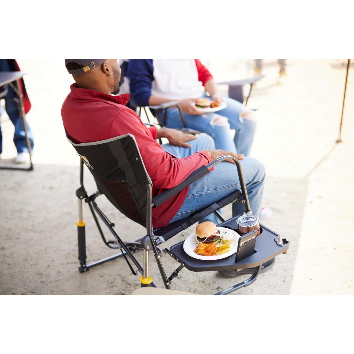 Extra room meets extra convenience in the GCI Outdoor Freestyle Rocker™ XL with Side Table. Featuring patented Spring-Action Rocking Technology™ for a smooth rocking motion, a wider seat with an increased weight capacity of 400 lbs., plus an integrated table, it’s the perfect combination of comfort, functionality and durability. The ergonomic design promotes a natural seated position, with padded armrests providing additional support when sitting down and standing up. A breathable mesh panel in the backrest enhances airflow to keep you cool and dry, while the foldable side table—with a built-in beverage holder, snack space, and a phone pocket—keeps essentials within reach. The durable, powder-coated steel frame features Eazy-Fold™ Technology for effortless setup and closure, along with a convenient carry handle for easy transport to all your outdoor activities.