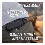 Customizable to your needs in the field, the Strongarm’s revolutionary sheath system is the first of its kind. The MOLLE compatible snap-together sheath is easy to use and can be mounted vertically on MOLLE, horizontally on a belt, or in traditional drop-leg fashion.