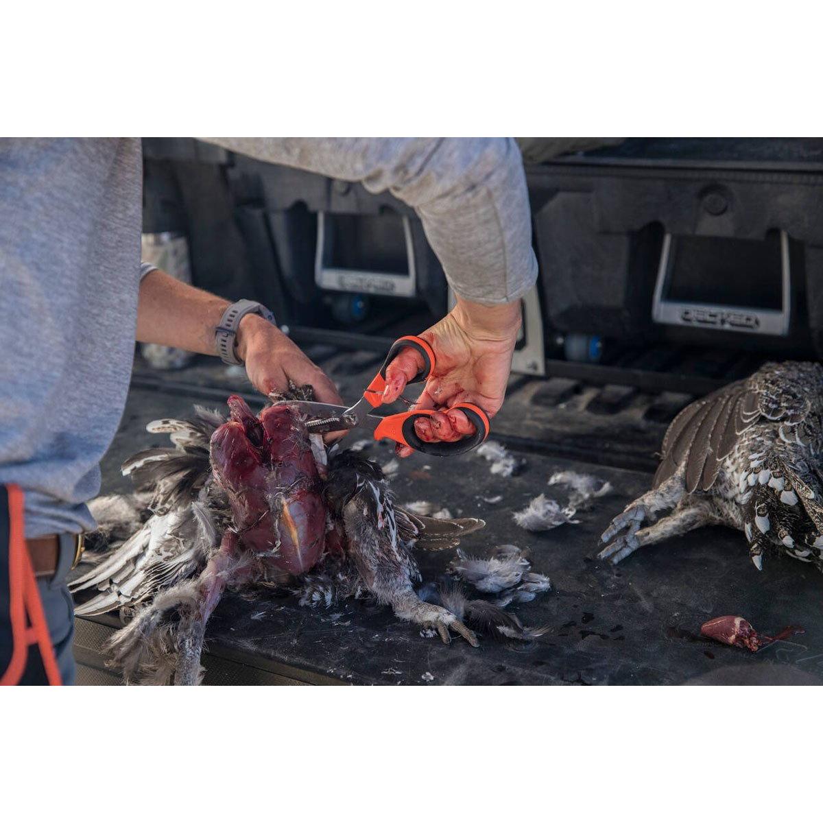 The Gerber Take-A-Part Game Shears are easy to use, easy to clean, and easy to spot. The serrated blades on these Gerber hunting shears cut through small game with ease, and can also be used for a variety of kitchen tasks. The handle features an improved grip design with rubber over-molding for a no-slip hold and easy control. For easy cleaning, a pivot pin on the game shears releases both blades for easy cleaning. With a Hi-Vis orange handle for visibility, the Gerber Take-A-Part Game Shears offer an easy way to clean small game.