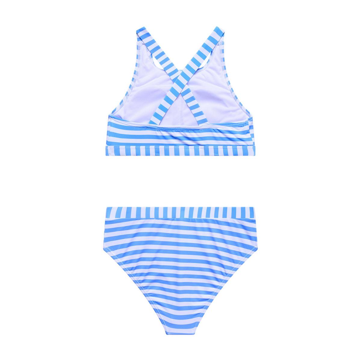 Look bright in this nautical stripe look of the Palm Paradise printed Bikini Set from Beach Lingo. Complete with an active pull over high neckline swim top and coordinating high waist swim bottoms. Crafted from soft, stretchy fabric for a comfortable fit. The bikini top has crisscross back straps with linear and horizontal print direction detail. The swim bottoms have a banded waistband and modest seat coverage.