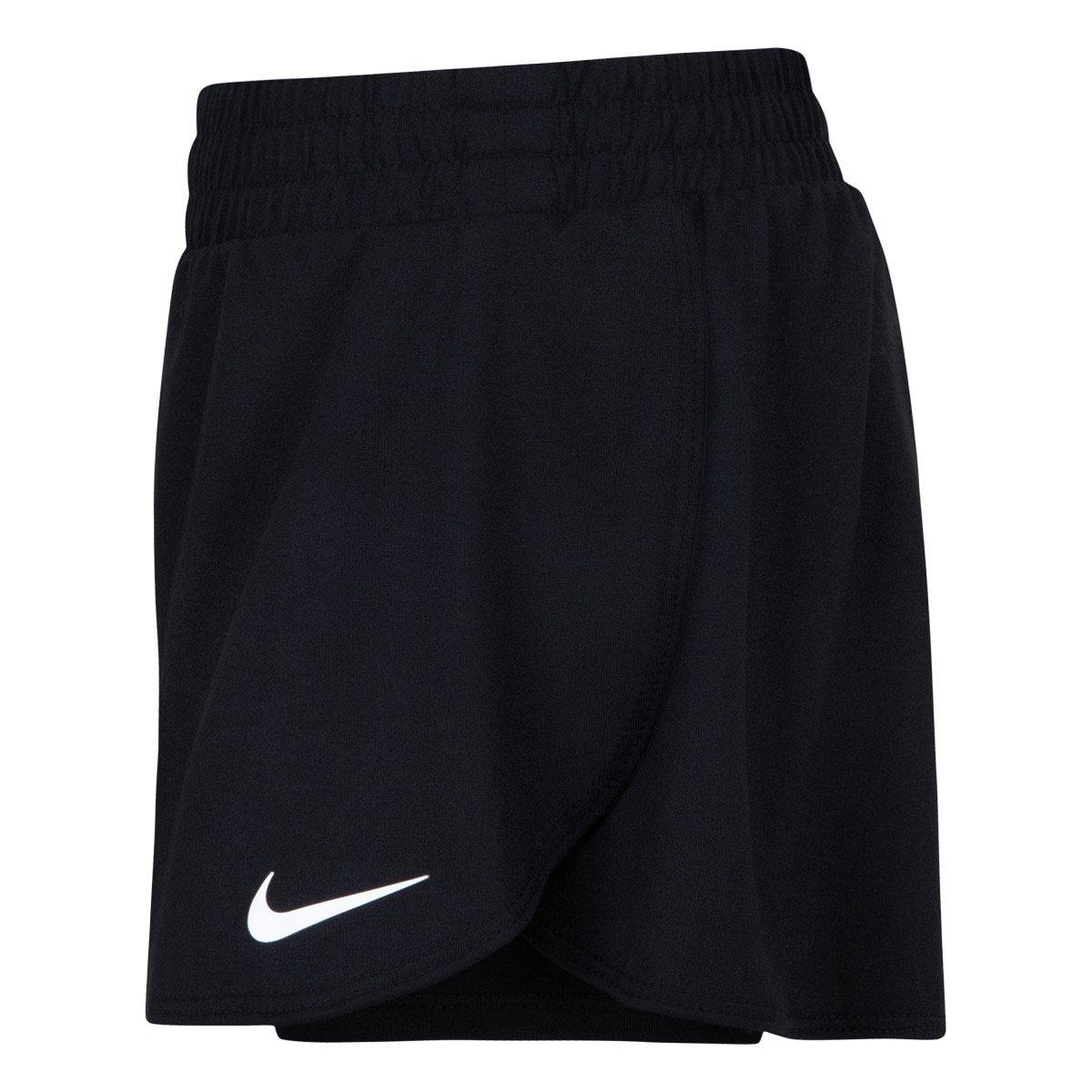 Little ones can get into the swing of things in these Nike shorts, made of soft stretch poly jersey in a flowy cut that creates the illusion of a skirt. The stretch waistband provides a comfy fit, splits on the outer sides provide freedom of movement and built-in undershorts provide full coverage. Both layers of these shorts are boosted with quick-drying, moisture-wicking Dri-FIT technology to help kids stay cool and dry for all day play.