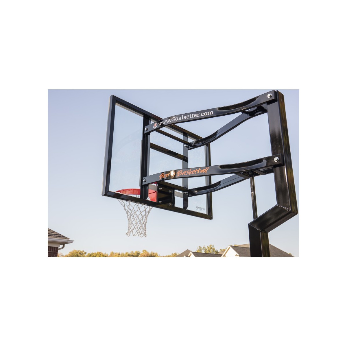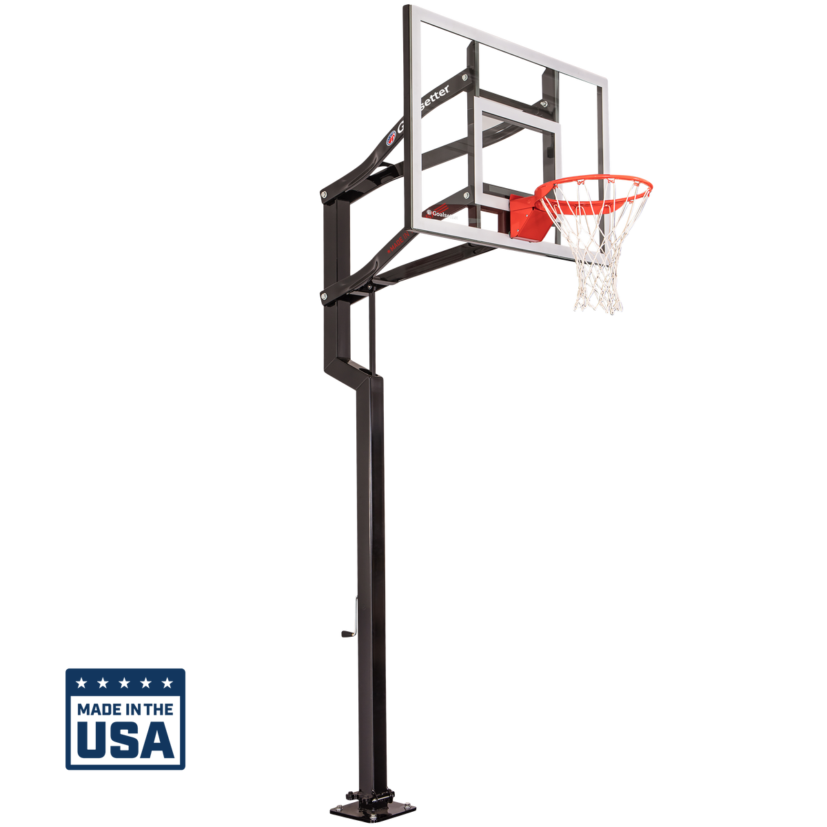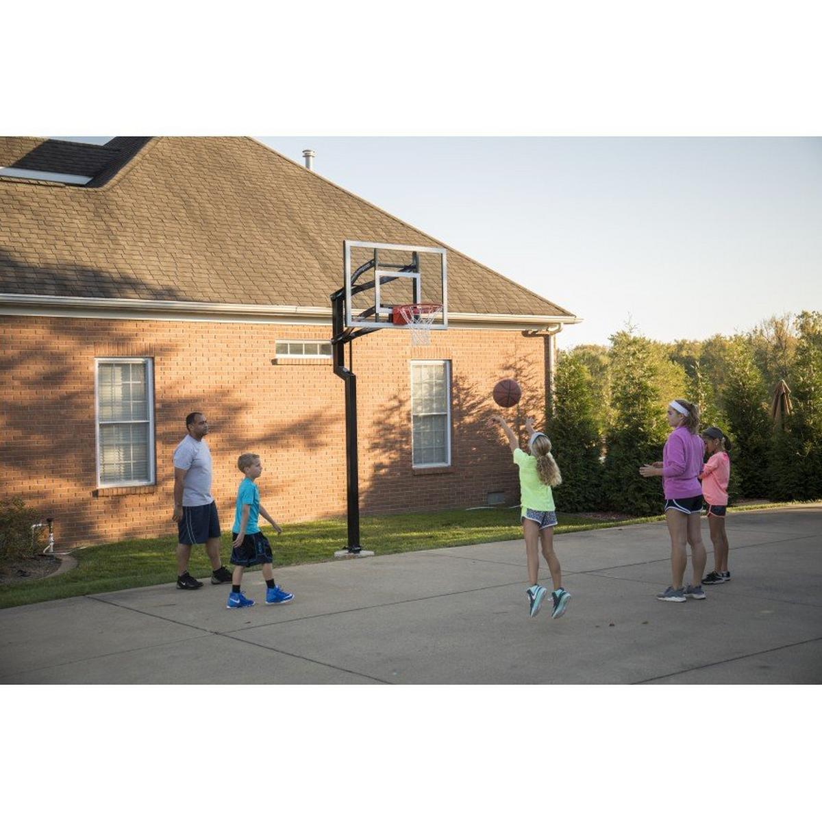 The Goalsetter Contender Basketball System is an American-made basketball hoop that's ideal for home and recreational use. Featuring a full-tempered glass backboard and a 1.5-inch structural steel H-frame, the Goalsetter Contender in-ground basketball system provides maximum stability and consistent ball response for competitive play. Designed with safety in mind, the Goalsetter Contender in-ground basketball hoop features a 2.5-inch offset from the pole and rounded corners and edges. Like all Goalsetter basketball hoops, the Contender is easy to adjust with the patented internal compression height adjustment system, making the rim infinitely adjustable from 6 feet to 10 feet. Add fun to your driveway this summer with the Goalsetter Contender Basketball System.