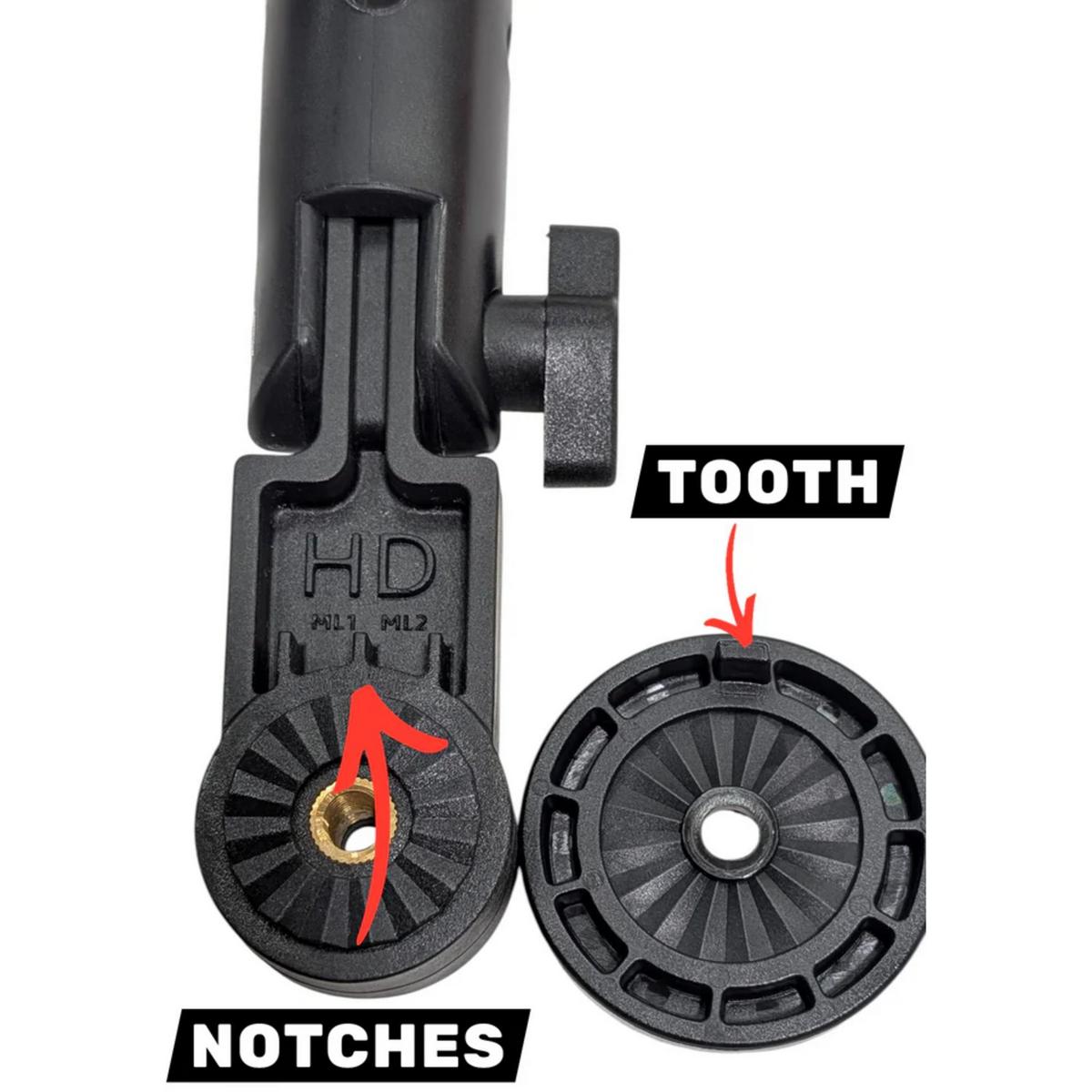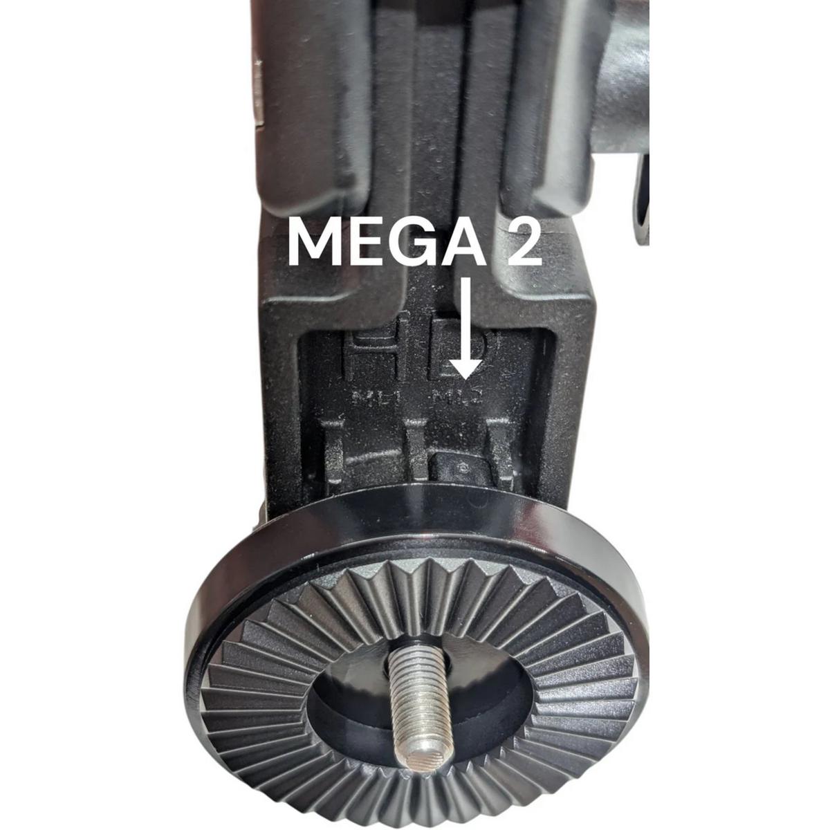 The HD Humminbird MEGA 1 and 2 connection kit includes a black single tooth adapter disk, 2 rubber washers, and Stainless steel 1/4-28 screw with Aluminum red anodized knob. Simple screw the knob set together, insert through the back of your HD Multi-Mount transducer mount (FITS ALL HD MULTIMOUNT TRANSDUCER MOUNTS), slide the black adapter disk in place and insert the disk tooth into the "Mega 1" or "Mega 2" slot. Now connect your MEGA transducer directly to the mount with no other factory mounting hardware in between.