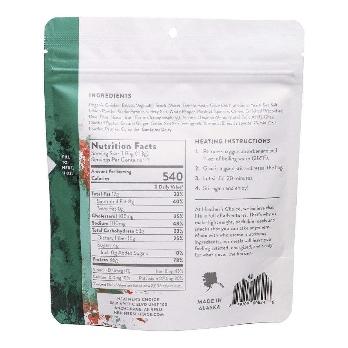 Organic Chicken Breast. Vegetable Stock (Water. Tomato Paste. Olive Oil. Nutritional Yeast. Sea Salt. Onion Powder. Garlic Powder. Celery Salt. White Pepper. Parsley). Spinach. Onion. Enriched Precooked Rice [Rice. Niacin. Iron (Ferric Orthophosphate). Thiamin (Thiamin Mononitrate). Folic Acid]. Ghee Clarified Butter. Ground Ginger. Garlic. Sea Salt. Fenugreek. Turmeric. Dried Jalapeños. Cumin. Chili Powder. Paprika. Coriander.