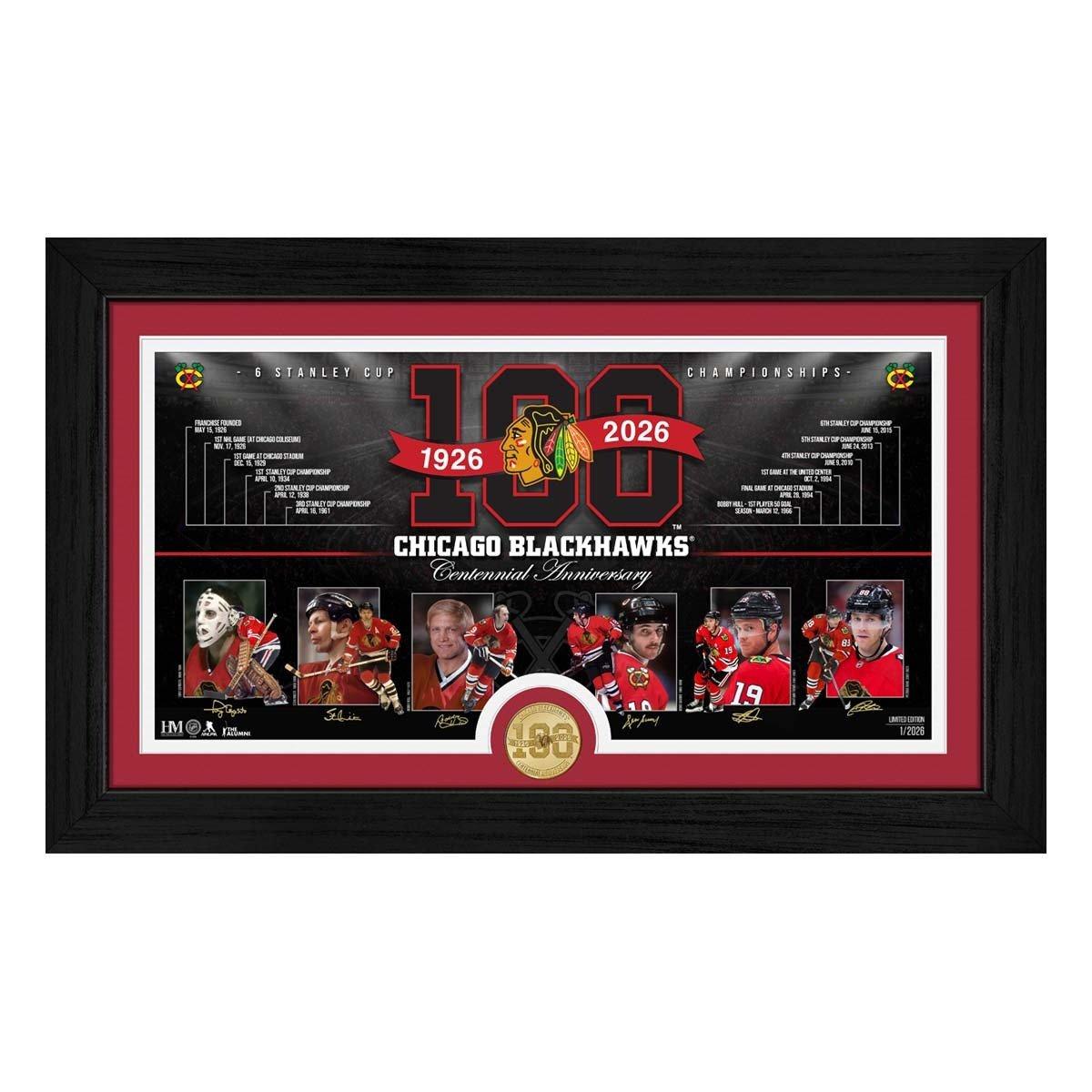 Honor a century of Chicago Blackhawks hockey with this limited-edition 12" x 20" Timeline Photo Mint. Presented in a black wood frame with double matting and acrylic glass, the centerpiece is a 15" x 7" custom timeline print that showcases the team’s unforgettable milestones and the most iconic moments in franchise history since 1926. The print features Blackhawks legends Tony Esposito, Stan Mikita, Bobby Hull, Denis Savard, Jonathan Toews, and Patrick Kane. Matted with the print is a solid bronze 39mm Chicago Blackhawks 100th Anniversary coin, minted with the official Blackhawks Centennial logo. This exclusive collectible is limited to just 2,026 individually numbered pieces, officially licensed by the NHL and NHLPA. Each frame comes with a certificate of authenticity and is proudly made in the U.S.A. by The Highland Mint.