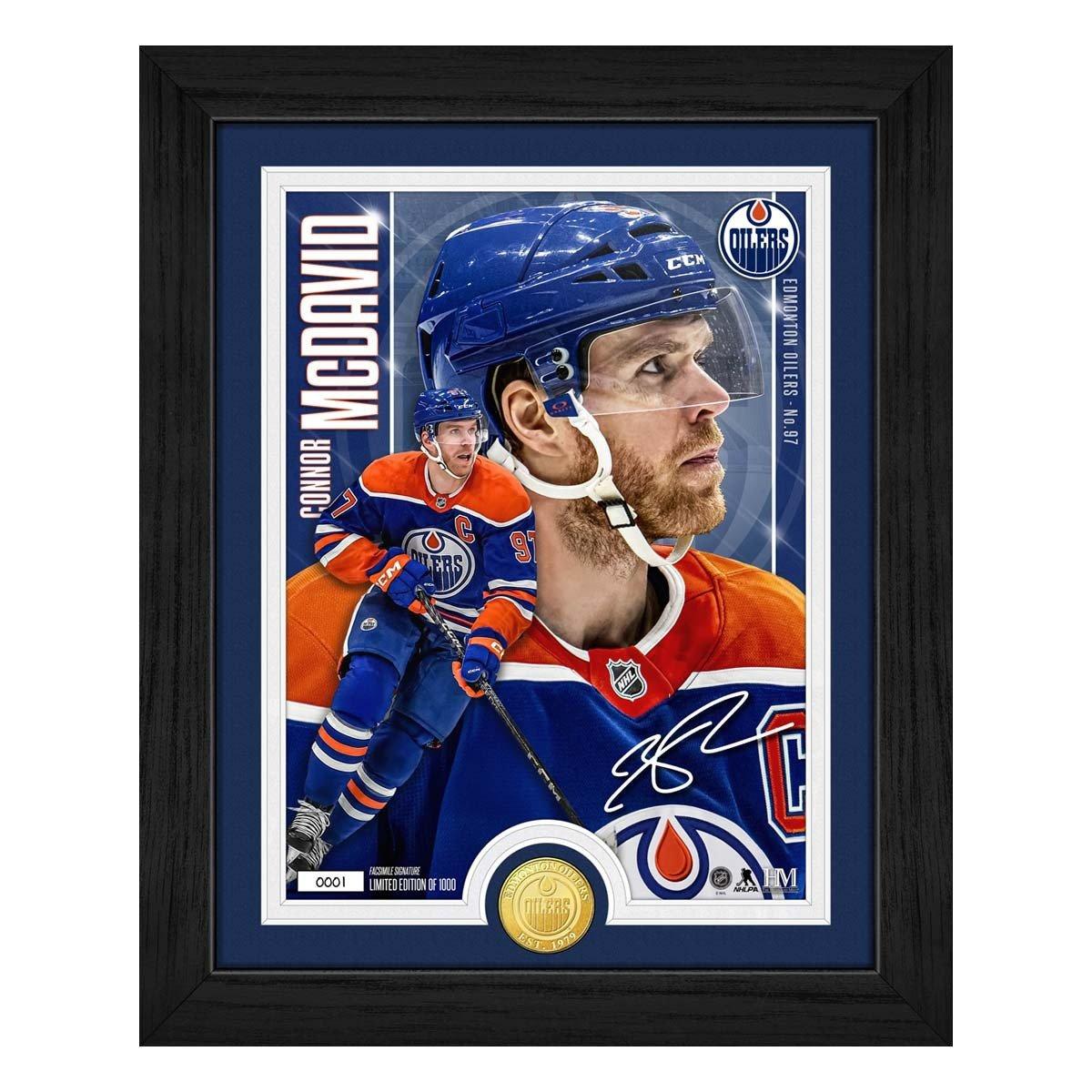 The Edmonton Oilers' Connor McDavid is featured in this limited edition 13"x16" framed collectible that includes a stunning 8"x11" custom-designed artist print and a minted 39mm Edmonton Oilers bronze coin. Elegantly double-matted and protected under acrylic glass, this premium display piece is a must-have for NHL fans and collectors. Only 1,000 individually numbered pieces exist — each officially licensed by the NHL and NHLPA. Each frame includes a certificate of authenticity. Proudly made in the U.S.A. by The Highland Mint, this collectible arrives ready to hang and ready to impress.