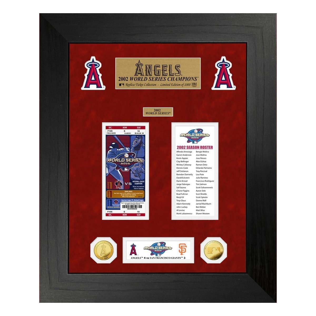 A limited edition of only 1000! Featured in a black 22" x 18" wood frame with 2.5" wide molding and double matting is the Los Angeles Angels commemorative World Series ticket collection! This collectible frame is highlighted with a gold plate 39mm team coin and a gold plate 39mm MLB Logo coin. Also matted in the frame are engraved nameplates and die cut team logos. Each frame has an individually numbered certificate of authenticity adhered to the back. Officially licensed by the MLB and proudly made in the U.S.A by The Highland Mint!