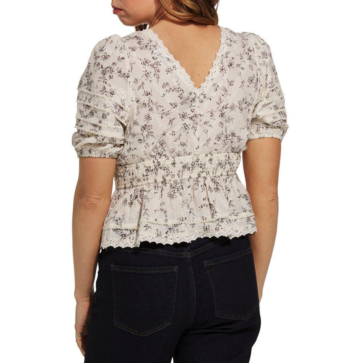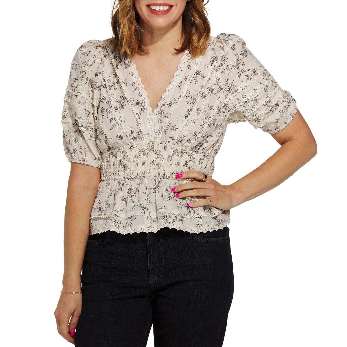 Women's DRESS FORUM Honey Butter Lace Trim Smocked Waist Peplum V-Neck Shirt
