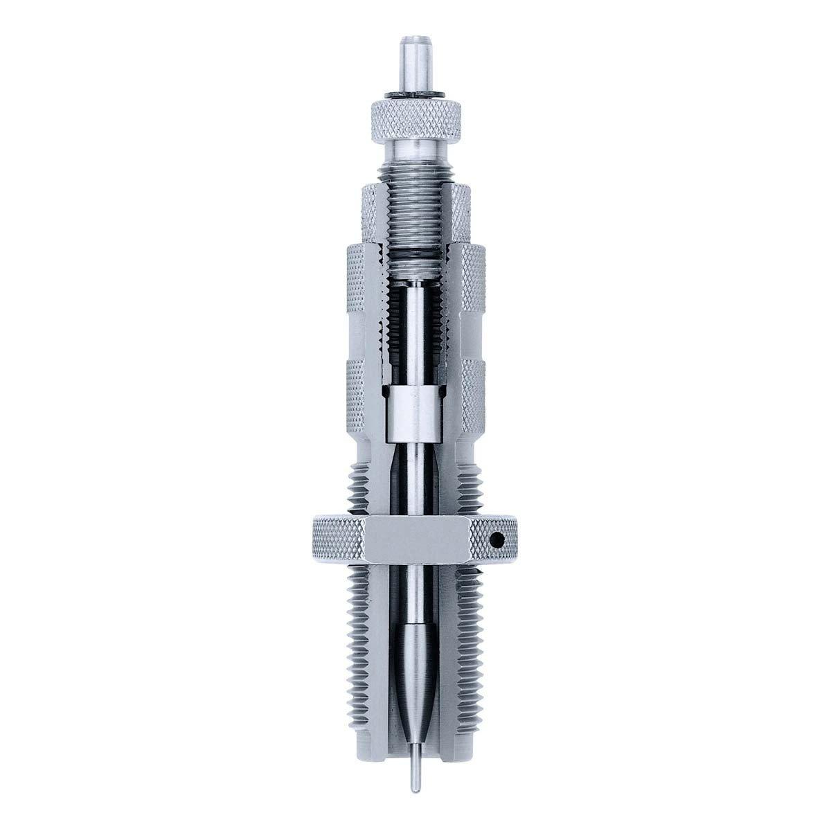 Seating die features seater adjustment screw, built-in crimper, locking retainer spring as well as a floating bullet seater alignment sleeve and seating stem, which pre-aligns the bullet and case before seating occurs.