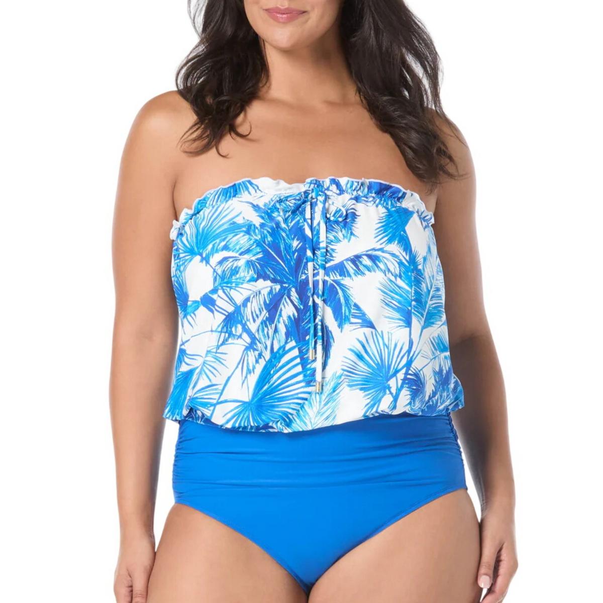 Get multiple looks in one with this multi-wear bandeau tankini top in a palm tree print. Ruffled details add a feminine flair to the neckline. A blouson tankini top flatters your midsection. Pair it with a coordinating bottom and cover ups for a complete look.