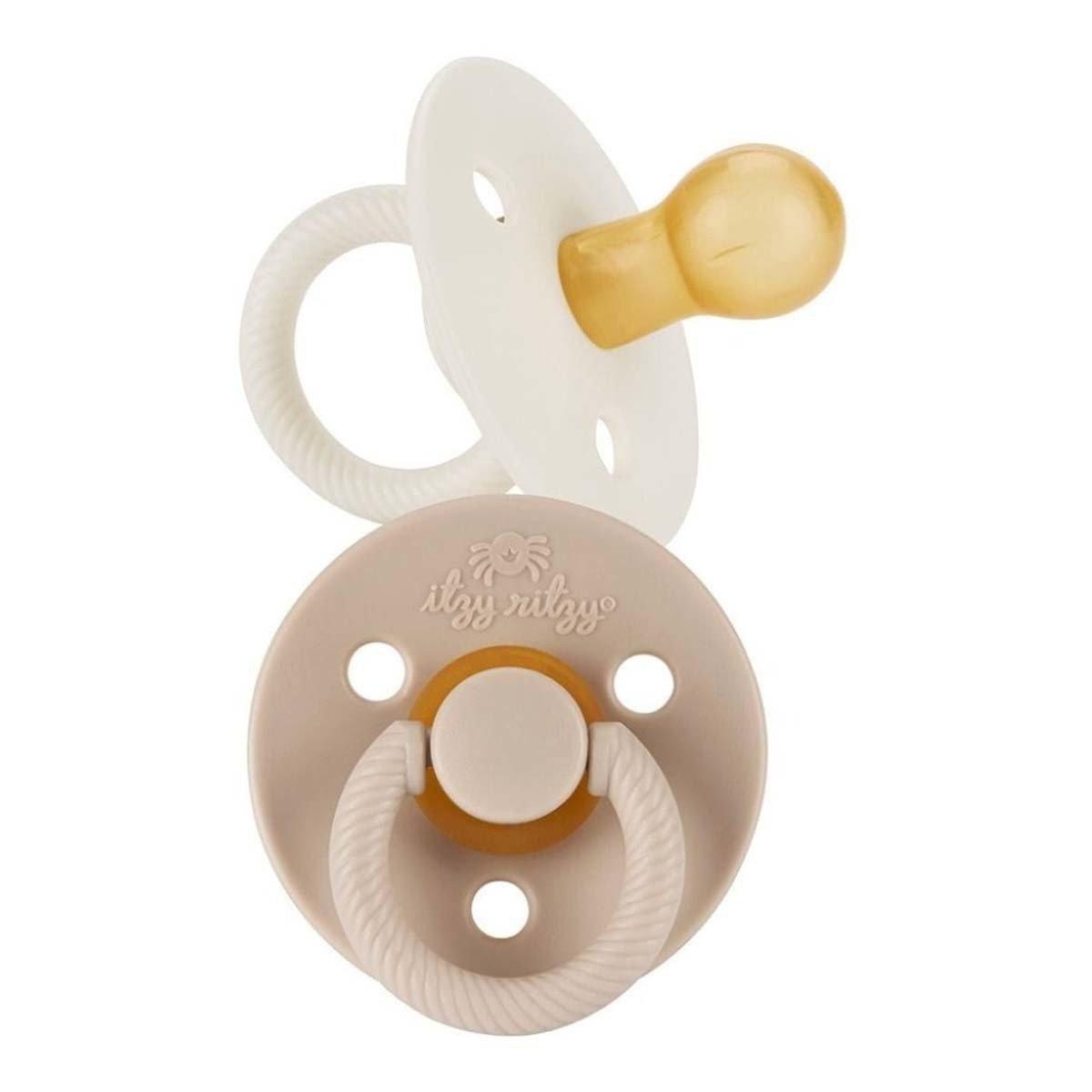 Meet the Itzy Soother™ Natural Rubber Pacifier! Each natural rubber binky features a cherry-shaped nipple to mimic breastfeeding and a shield accented with a cable-style handle. Doubly-soothing, every two-pack set includes two complementary colors. These pacifiers meet ASTM safety standards and are BPA free and PVC free. You and your little one will enjoy tranquility (and chill vibes!) once they meet their Itzy Soother™.