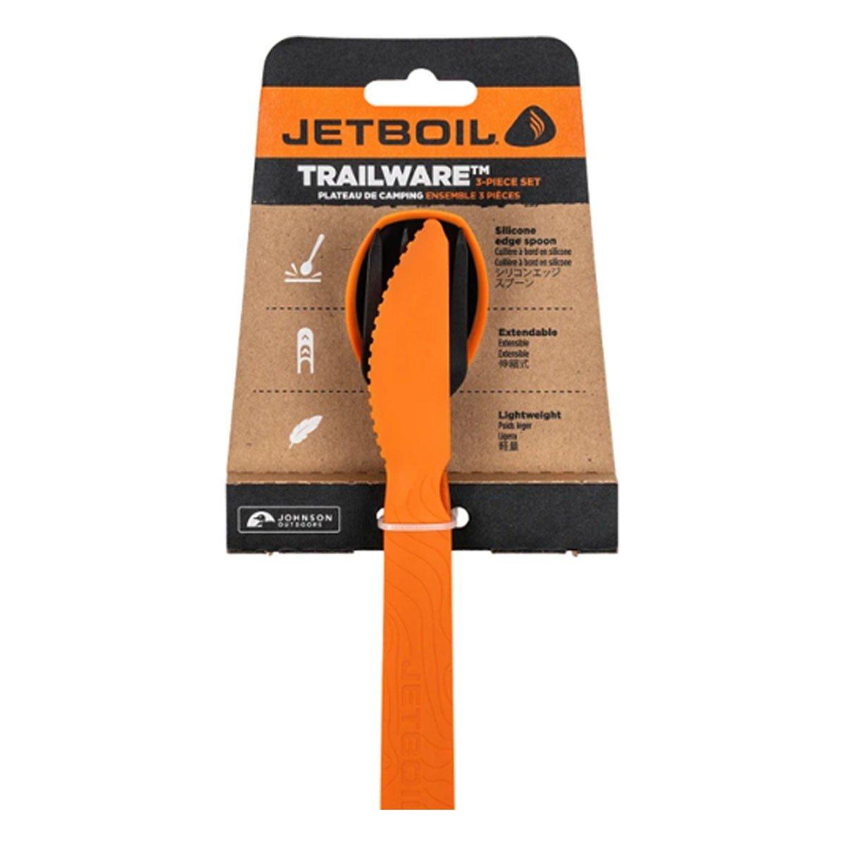The perfect outdoor utensil set. Forget about the mess and hassle of cleaning on the trail. The new Jetboil TrailWare is designed to easily extend and reach inside a Jetboil cookpot or dehydrated meal package. The unique silicone edge spoon will easily scrape every morsel while minimizing scratches to the pot surface. All three utensils snap together for easy storage and transport.