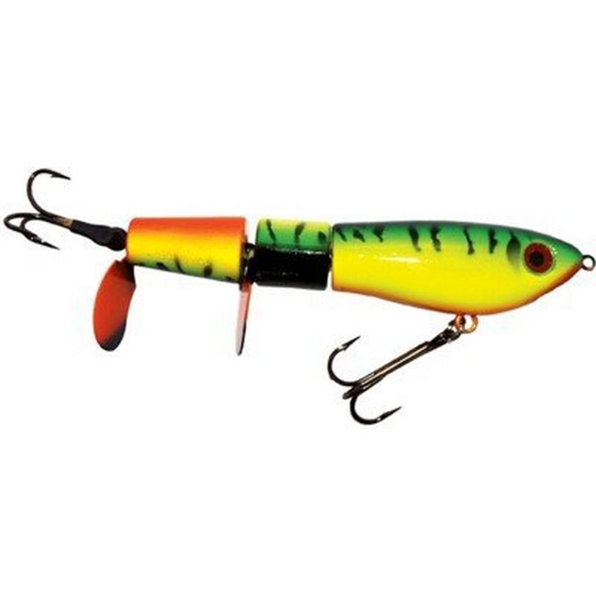 This topwater lure is built with two rotating props for extra noise and commotion of the water. Cast it out with a steady retrieve and hold on. Always use thick diameter, heavyweight line for topwater fishing to reduce line drag, line sinkage and improve overall buoyancy. A medium/heavy power musky action rod of at least 6 feet also promotes better hooksets. After the cast, retrieve faster initially while simultaneously lifting upwards on your rod tip to lift as much of the line off the water as possible. Then, level off your rod tip angle as the lure nears the boat finishing up with the rod tip actually touching the water. If the target is muskies, always finish with a figure 8 maneuver at boatside to trigger any followers.