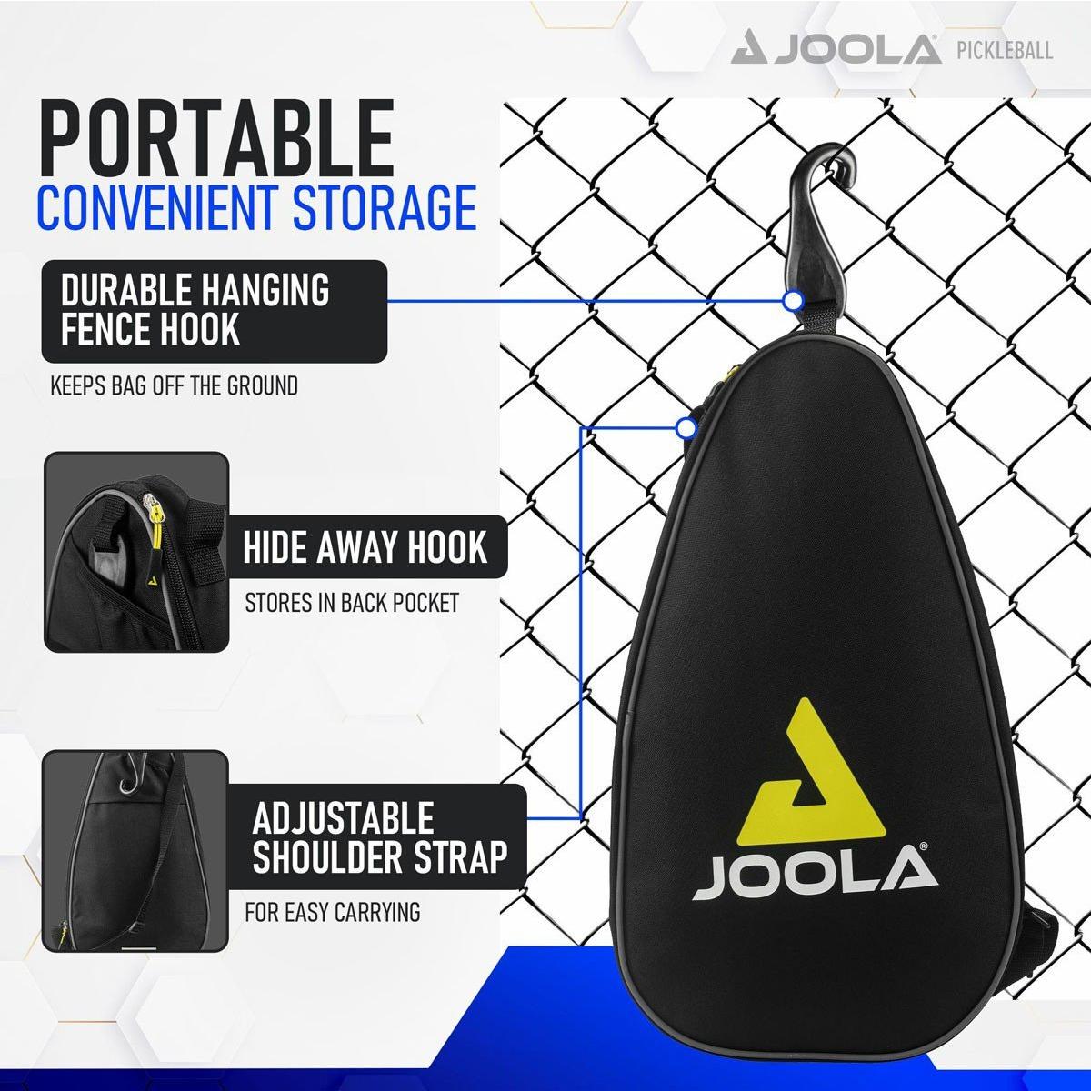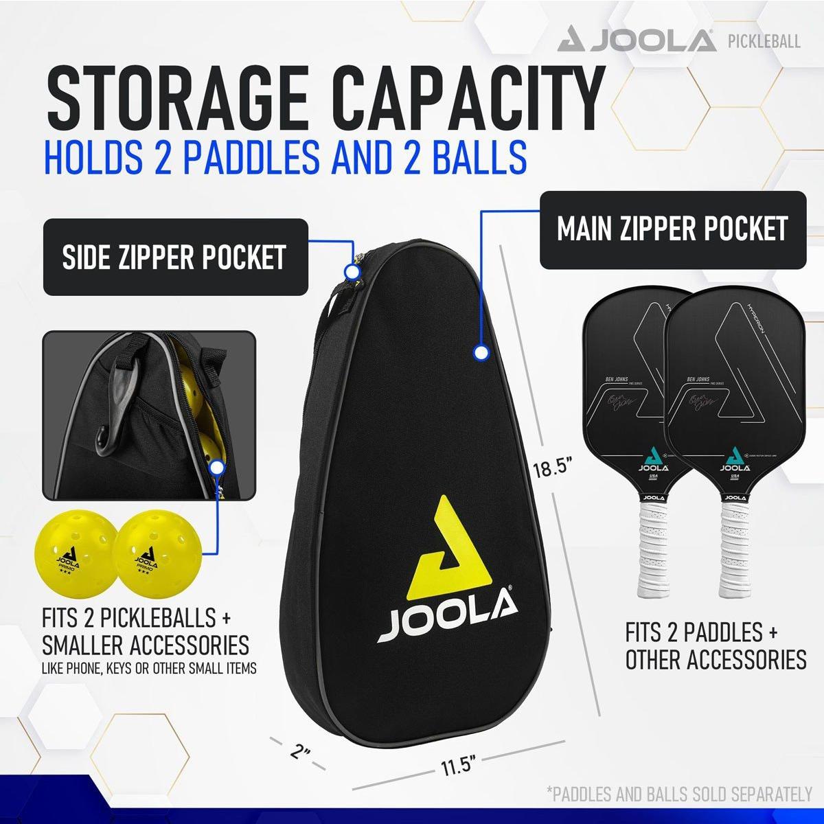 The JOOLA Vision Duo Pickleball Paddle Bag easily fits 2 paddles in the main compartment plus 2 pickleball balls and small accessories such as keys and phone in the side zipper pocket. The durable, hideaway hook makes it easy to hang on any chain-link fence. This paddle bag measures 18 x 10.5 x 2.5 inches. A main compartment and a small side compartments fit everything you need to head to the pickleball courts.
