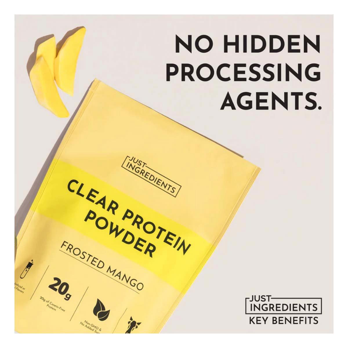 {"reviews":[],"offset":0,"limit":10,"total":0}"Full Description:\nJust Ingredients Clear Protein Powder offers a revolutionary, light alternative to your traditional creamy protein shake, perfect for a refreshing post-workout or mid-day sip. Each serving delivers 21g of high-quality, grass-fed whey protein isolate that is carefully filtered, making it casein-free and easier on digestion. This powder is uniquely flavored with real fruit and simple ingredients, ensuring a crisp, natural taste without any artificial flavors or sweeteners. Formulated to be smooth and refreshing, the Just Ingredients Clear Protein is the ideal choice for those seeking clean nutrition and a light, delicious boost to their daily protein intake.\n\nFeatures:\n\u003cul>\n\u003cli>Designed to be a light protein drink with a smooth, refreshing texture—not a thick shake.\u003c/li>\n\u003cli>Flavored with real fruit for a natural, crisp taste with no artificial or natural flavors.\u003c/li>\n\u003cli>MCT oil is used as a defoaming agent, a better alternative to conventional additives.\u003c/li>\n\u003cli>Formulated without added sugar, artificial sweeteners, colors, or inflammatory oils.\u003c/li>\n\u003cli>Carefully filtered to be casein-free and low in lactose for easier digestion.\u003c/li>\n\u003cli>Provides 21g of high-quality, grass-fed whey protein isolate per serving.\u003c/li>\n\u003c/ul>\n\nSpecifications:\n\u003cul>\n\u003cli>Grass-Fed Whey Protein\u003c/li>\n\u003cli>Made with Real Fruit\u003c/li>\n\u003cli>20 Servings per Bag\u003c/li>\n\u003cli>22g Protein\u003c/li>\n\u003c/ul>\n"
