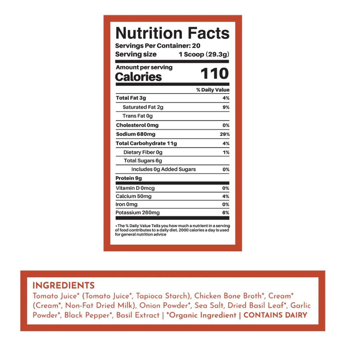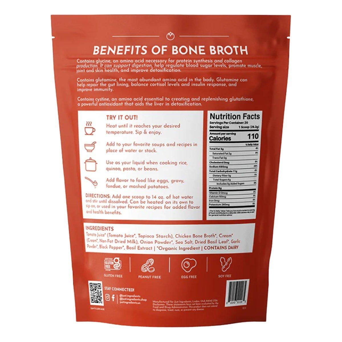 Tomato Basil Bone Broth Powder, delivering 9g of protein and essential amino acids. Formulated with whole food ingredients and free from artificial additives, it's a flavorful and wholesome option to just simply sip throughout your day.