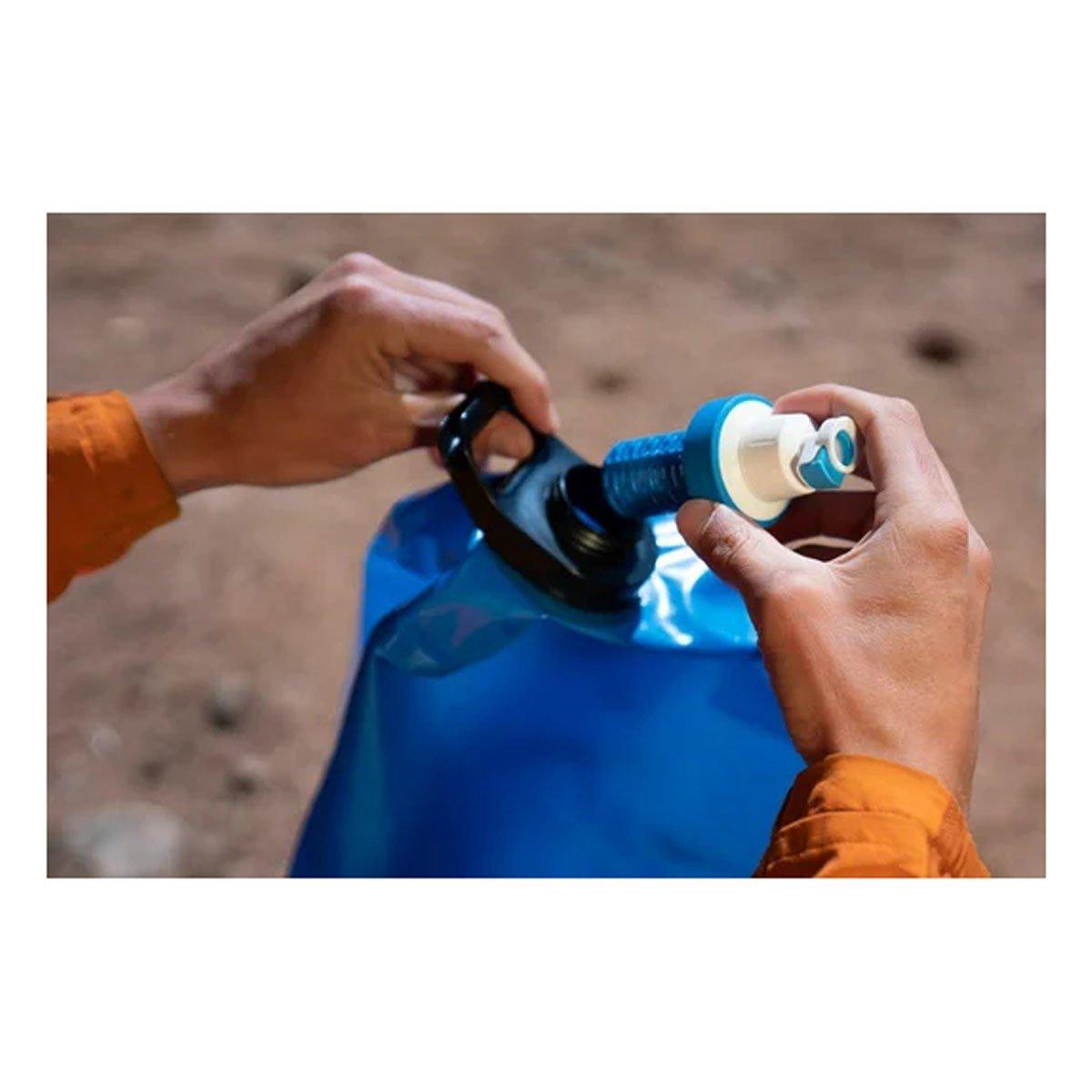 Filtered water can be stored in a separate container, bottle, or hydration bladder (using included quick-connect fittings). The opening of the container, bottle, or bag for filtered water should be as small as possible to prevent dirt from getting in. If the filtered water is not to be used on the same day, use Katadyn