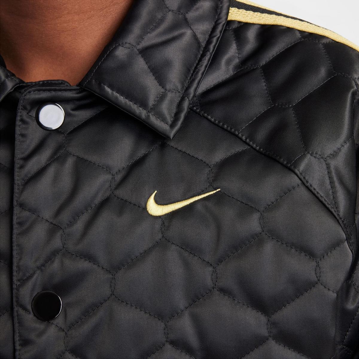Shiny satin gives this water-repellent bomber jacket a premium look worthy of any all-star in the making. Its quilted construction nods to the chain link fences often found around outdoor courts while knit tape with mesh details draw inspiration from basketball nets. Slip it on and let others know who owns the court.