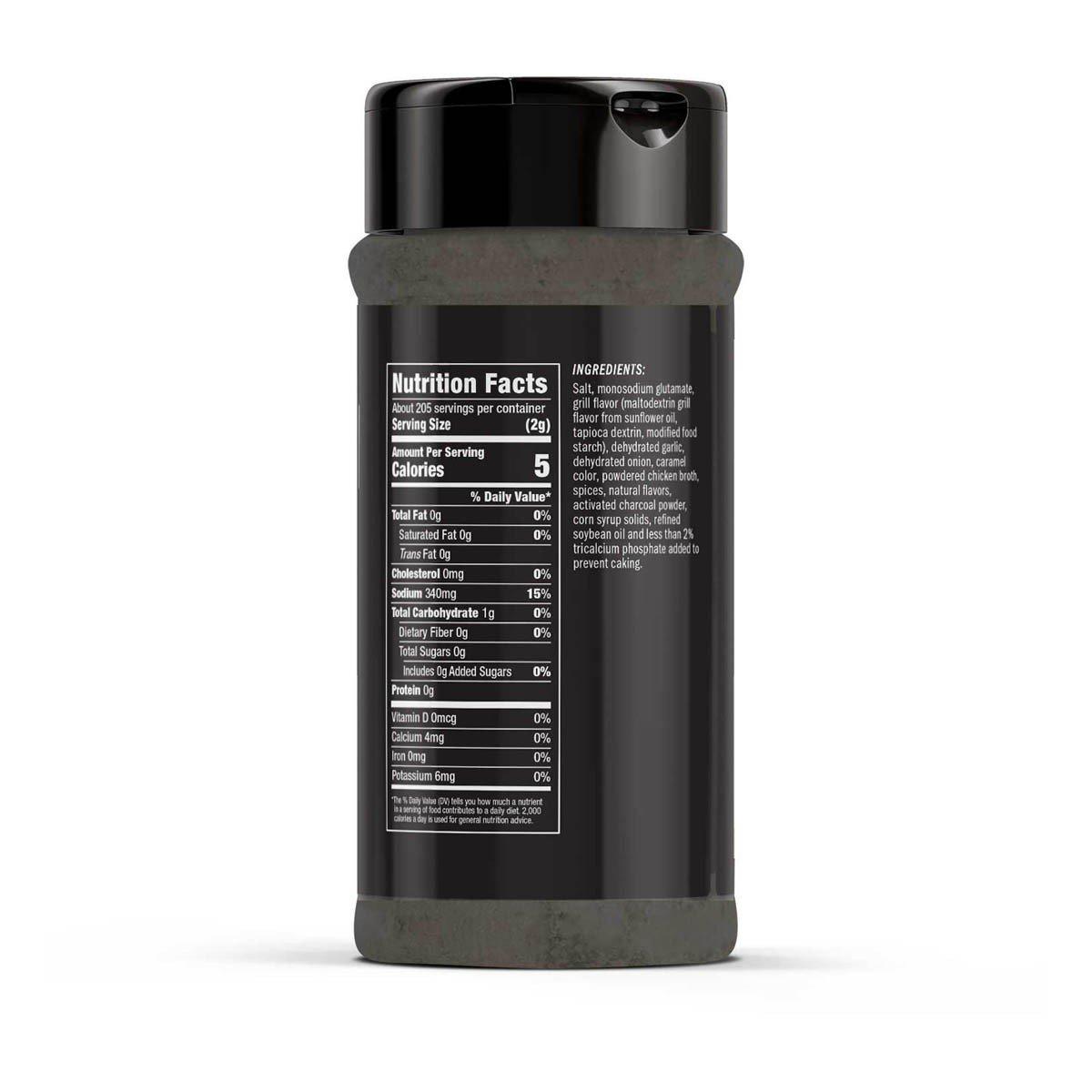 Ingredients: Salt, monosodium glutamate, grill flavor (maltodextrin grill flavor from sunflower oil, tapioca dextrin, modified food starch), dehydrated garlic, dehydrated onion, caramel color, powdered chicken broth, spices, natural flavors, activated charcoal powder, corn syrup solids, refined soybean oil and less than 2% tricalcium phosphate added to prevent caking.