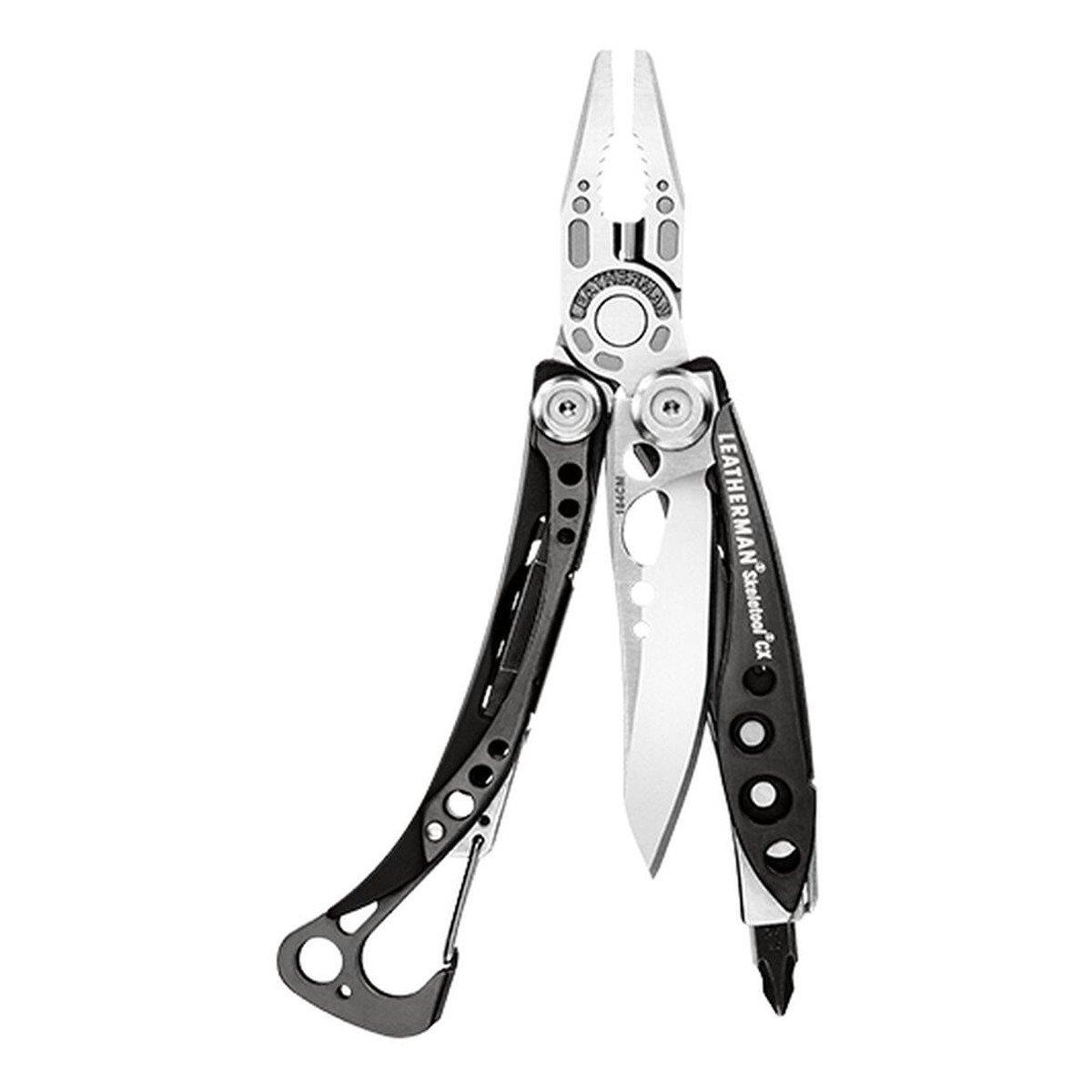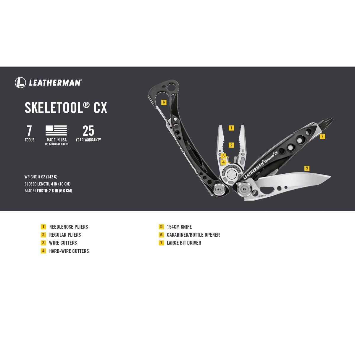 The sleek new Leatherman Skeletool CX gets you back to basics... very cool basics. The Skeletool CX has only the most necessary of multi-tool features because sometimes that's all you need. With a 154CM stainless steel blade pliers bit driver pocket clip and carabiner/bottle opener you're set. Lightweight low volume perfect size. The Skeletool CX: who says more is better?
