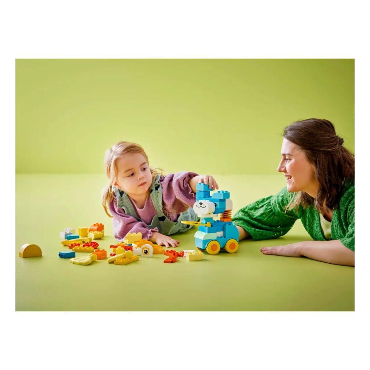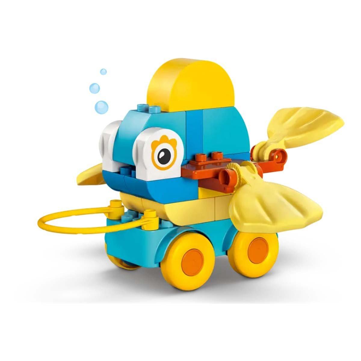 Boost toddlers’ creativity with the 3in1 Animals on Wheels (10448) building toy. Little animal lovers will find countless ways to enjoy imaginative play as they build the duck, fish or dog toy for preschool kids, or even create all-new animals! Preschool kids who love LEGO® DUPLO® vehicle toys build their figures on a wheelbase and can enjoy sending their animals zipping along or pulling them along with the handle.