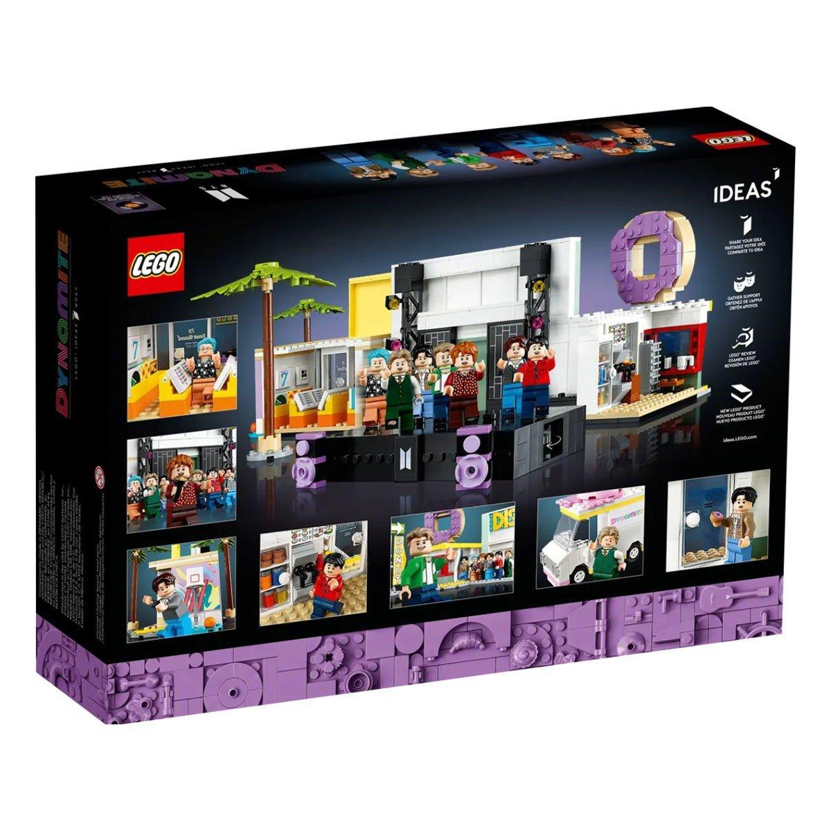 Capture the joyful energy of 21st-century pop icons RM, Jin, SUGA, j-hope, Jimin, V and Jung Kook with the LEGO® Ideas BTS Dynamite (21339) music video set. Find your building groove to recreate colorful scenes from the video for their multi-platinum single Dynamite, with LEGO brick versions of the disco, record store, donut store, ice-cream truck and more. Add LEGO minifigures of the group members to the different locations or place them all on the special stage and turn the wheel to see them dance.