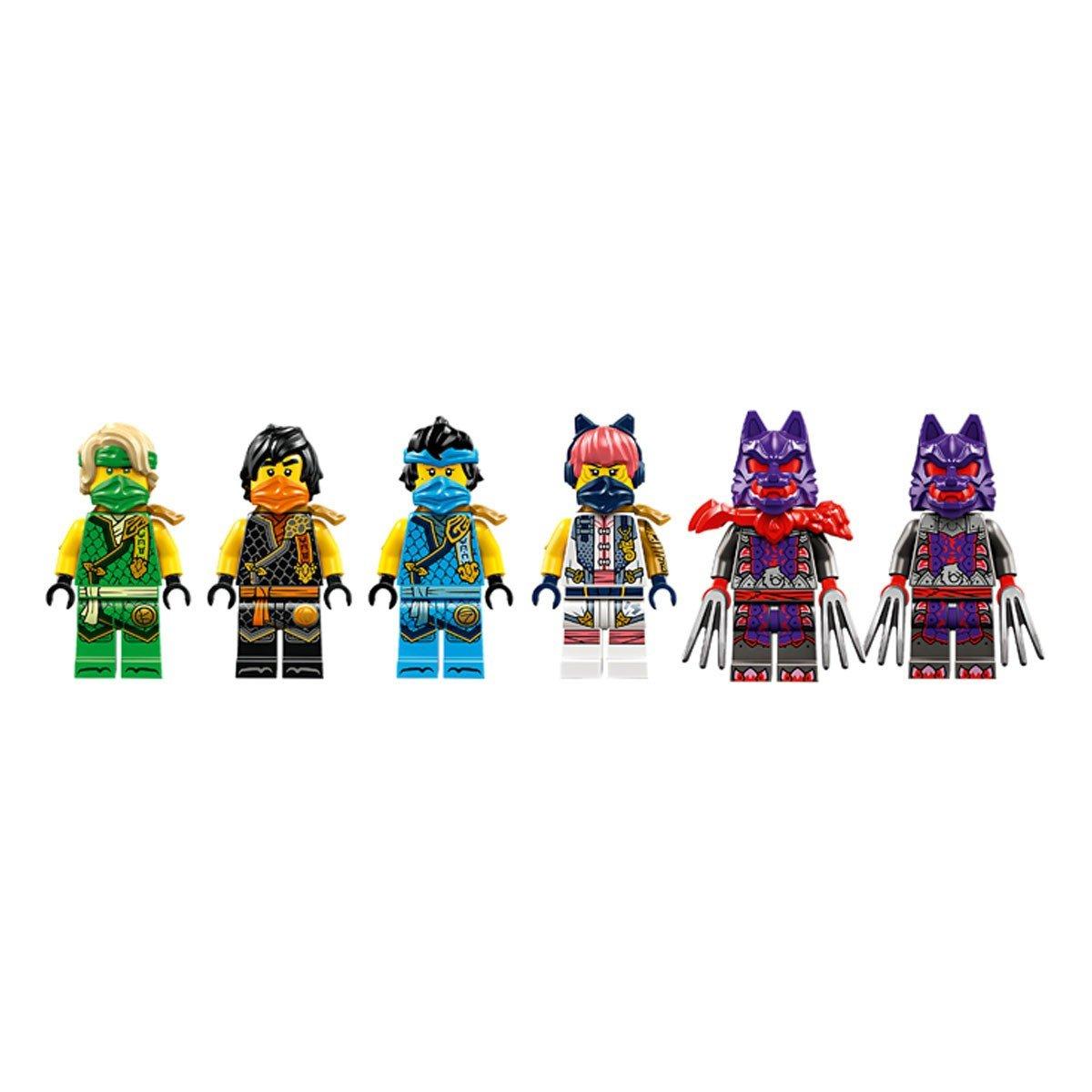 This vehicle playset comes with 6 NINJAGO minifigures: ninja Sora, Lloyd, Nya and Cole, dressed in their special tournament armor and armed with katana sword accessories, and their battle rivals, a Wolf Mask Warrior and Wolf Mask General.