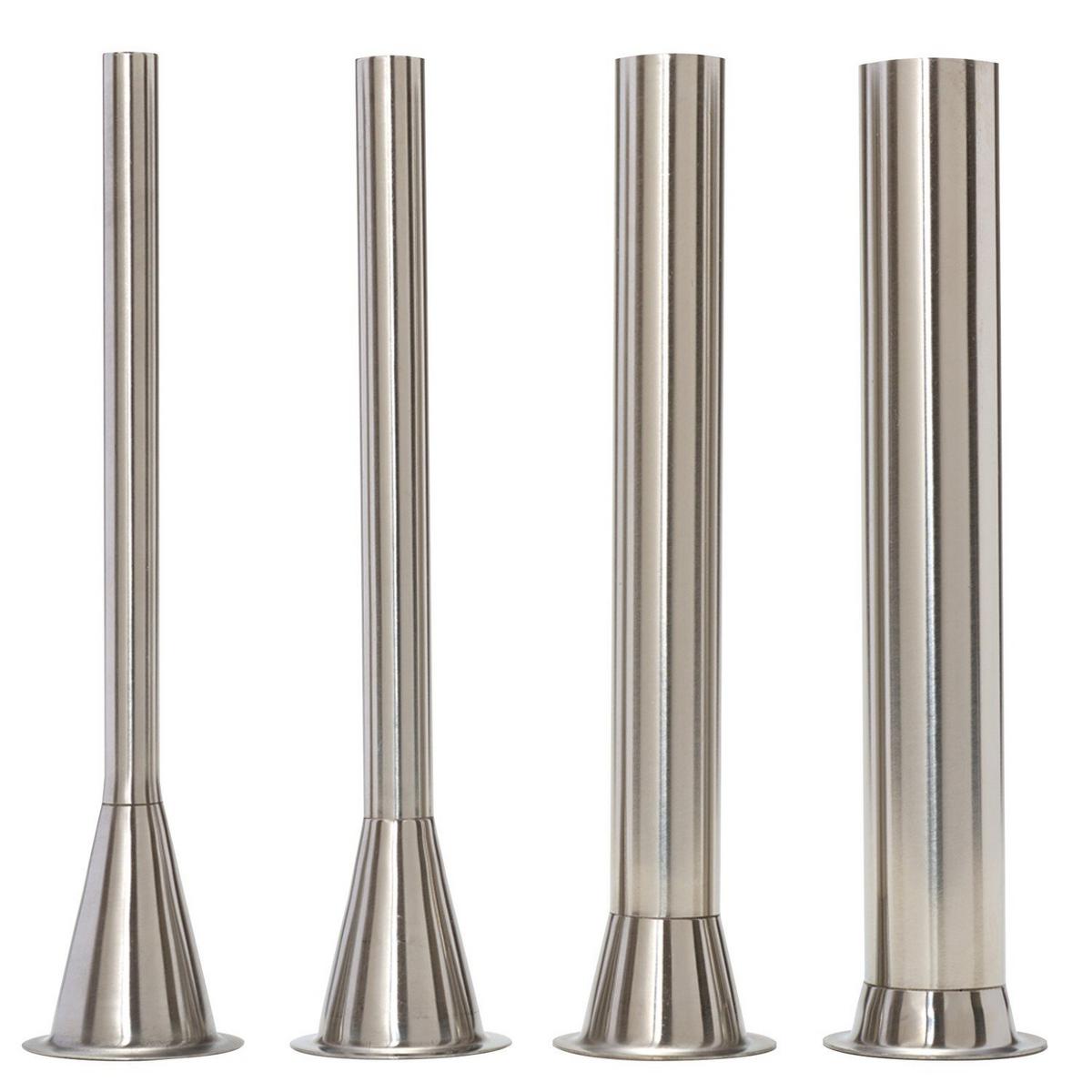 The stuffer comes with four stuffing tubes to accommodate various sausage sizes and types, including snack sticks (1/2", 5/8", 1" 1/1/4" OD). A crank handle is also included for non-motorized use.