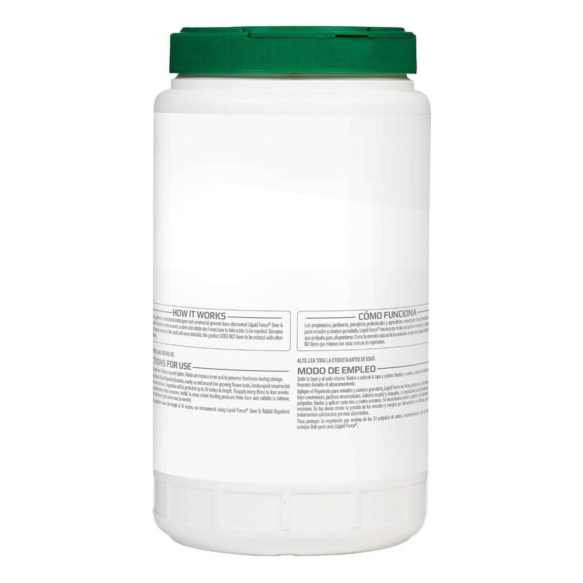 Liquid Fence Deer & Rabbit Repellent Granular creates an invisible barrier against deer and rabbits in low-growing flower beds, landscaped ornamental gardens, ground cover and lawns. This rain-resistant formula is harmless to plants and animals when used and stored as directed. It works on scent, so deer and rabbits don’t even have to take a bite to be repelled. Because the animals’ natural aversion to this scent will never diminish, this product does not have to be rotated with other repellent brands. Shake these granules evenly around the treatment area and reapply every three to four weeks or after excessive rainfall. In areas where animal activity is intense, additional and/or heavier applications may be needed. Vegetation will be protected up to 24 inches in height – for protection above that height, spray Liquid Fence Deer & Rabbit Repellent Ready-To-Use instead. See product label for complete directions for use.