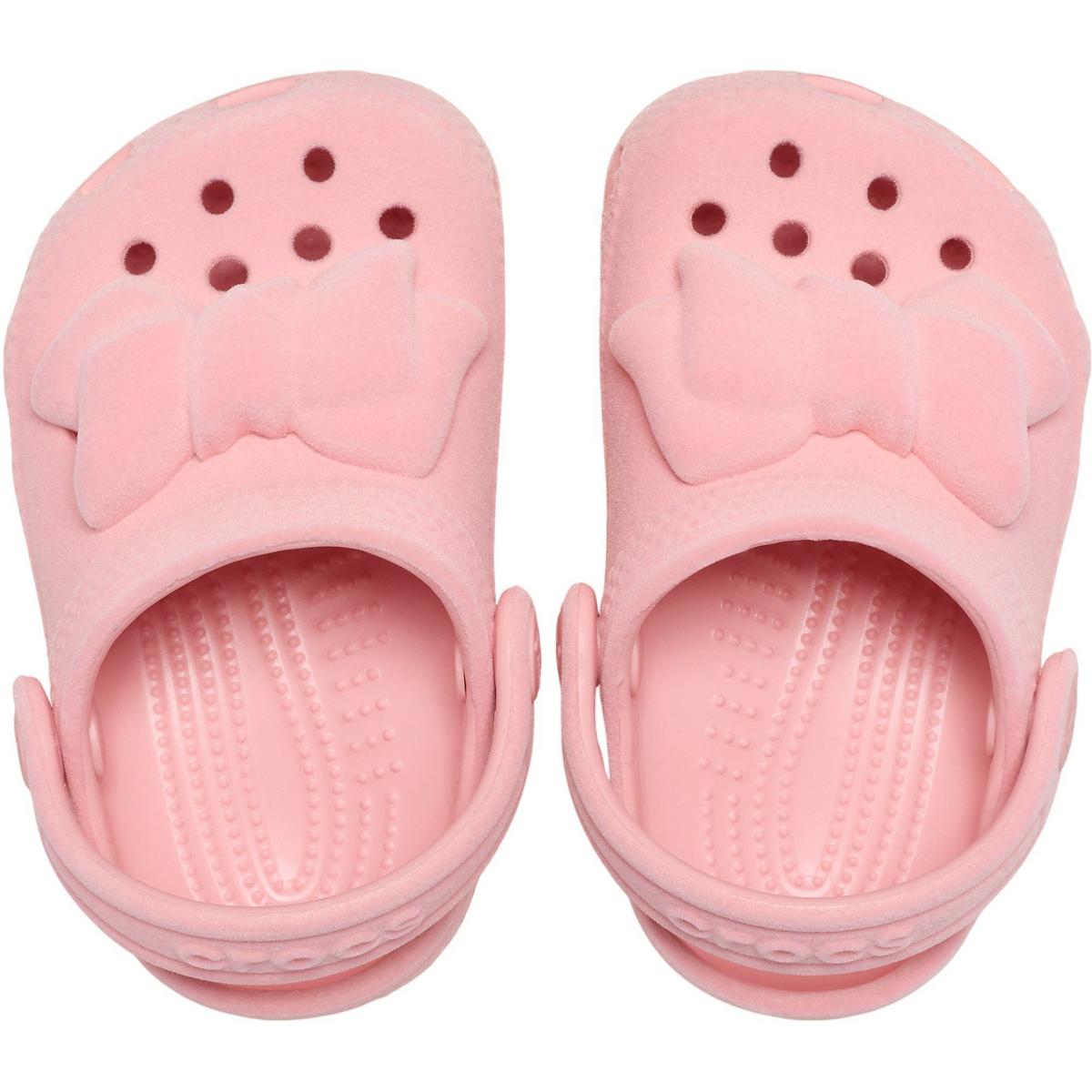 Add a touch of sparkle to every step with the Little Kids' Crocs Littles Velvet Bow Clogs. These charming clogs feature a soft, velvety upper adorned with a cute bow, making them perfect for everyday adventures or special occasions. Crafted from lightweight, flexible Croslite™ material, they provide all-day comfort and support for little feet. The pivoting heel strap ensures a secure fit, while the ventilation ports keep feet cool and comfortable. Stylish, playful, and oh-so-comfy, these clogs are a must-have for little trendsetters.