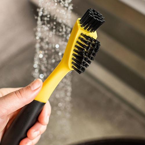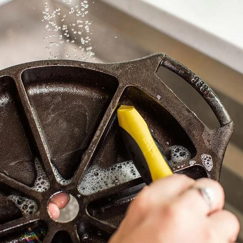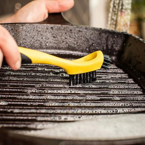Food stuck in a tough spot? Meet a groove cleaning brush designed to remove cooked-on food from corners, grooves, and between grill ribs. It features two narrow brush heads made for tight-space cleaning, plus a pointed handle for scraping. Made of molded plastic, with a no-slip silicone grip to reach every corner easily. Perfect for pans with ridges, wedge pans, loaf pans, grilling pans, and all your favorite cast iron cookware.