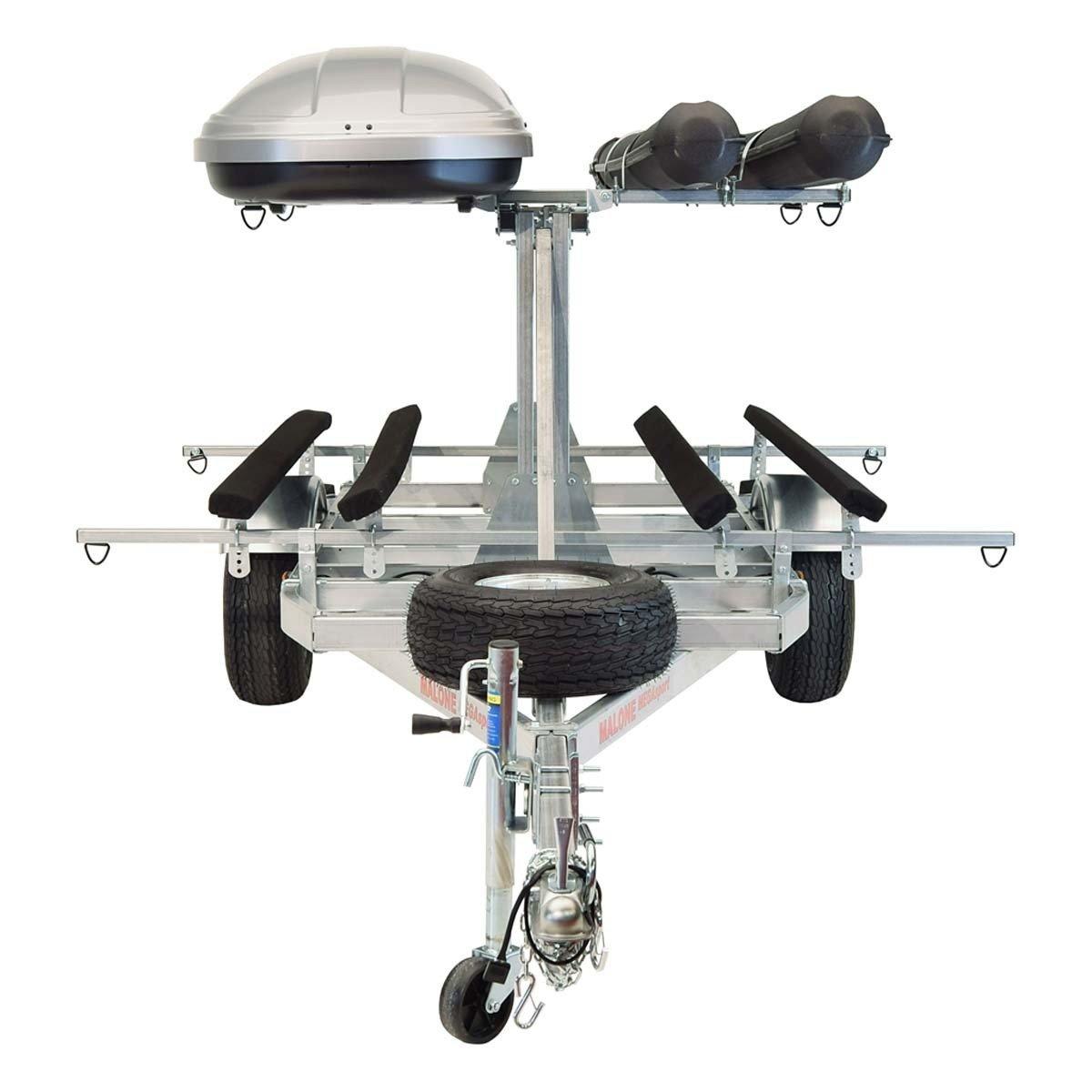 The MPG550-LBB is a MegaSport™ LowBed™ Trailer fully outfitted with a 2nd Tier Kit, MPG910 Profile™ Roof Box, 2 sets of Rod Tubes, two Large Kayak Bunks and a Spare Tire with Locking Attachment. This set-up represents our top "Pro Level" offering for transport of multiple large fishing kayaks with nearly any hull configuration.