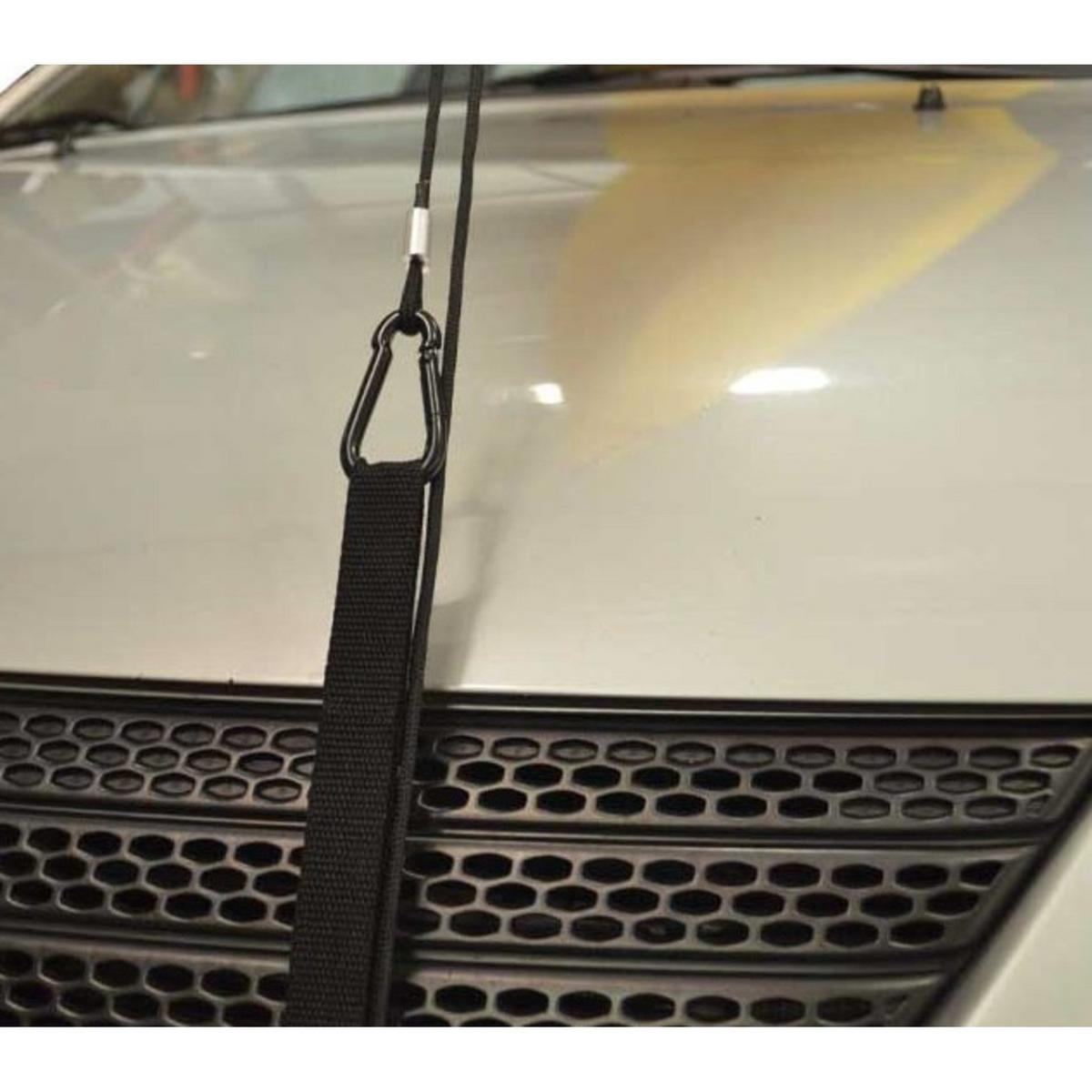 Ratchet pulleys with carabiners quickly secure cargo to the vehicle